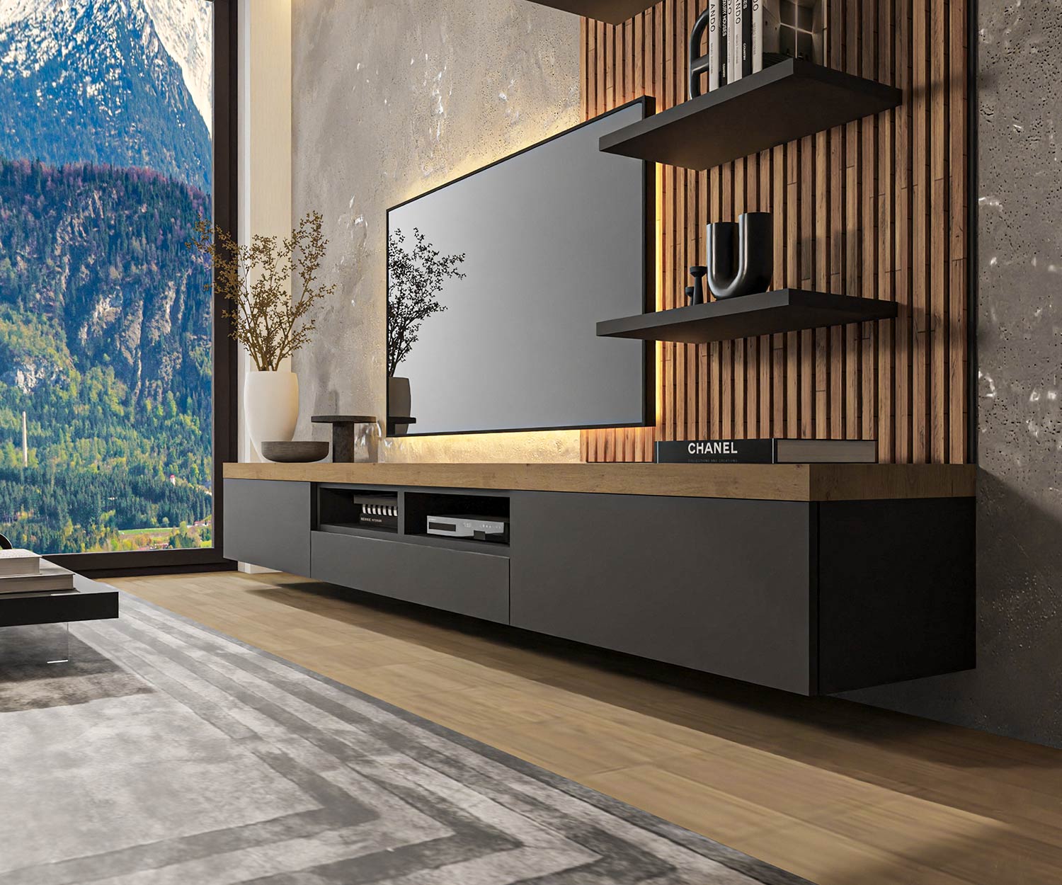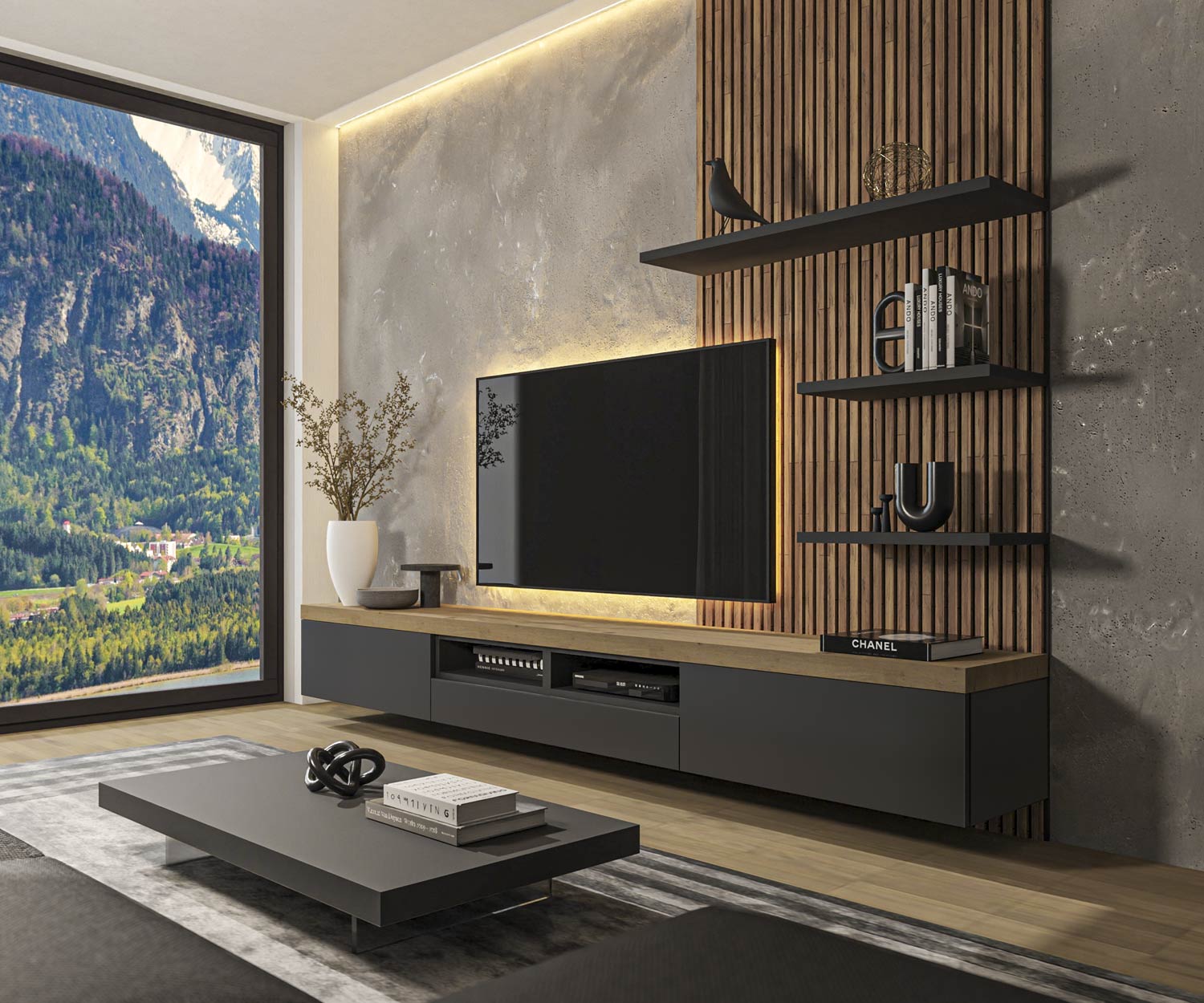 Livitalia Questo moderno mobile TV a parete C101 convince grazie a un pannello basso galleggiante che, con il suo spessore di 6 cm, offre un aspetto particolarmente solido e di alta qualità. Nonostante la larghezza di 300 cm, il mobile basso risulta leggero ed elegante grazie al design a parete. I tre ripiani a parete, perfettamente coordinati con il pannello basso, offrono ulteriore spazio per riporre gli oggetti.