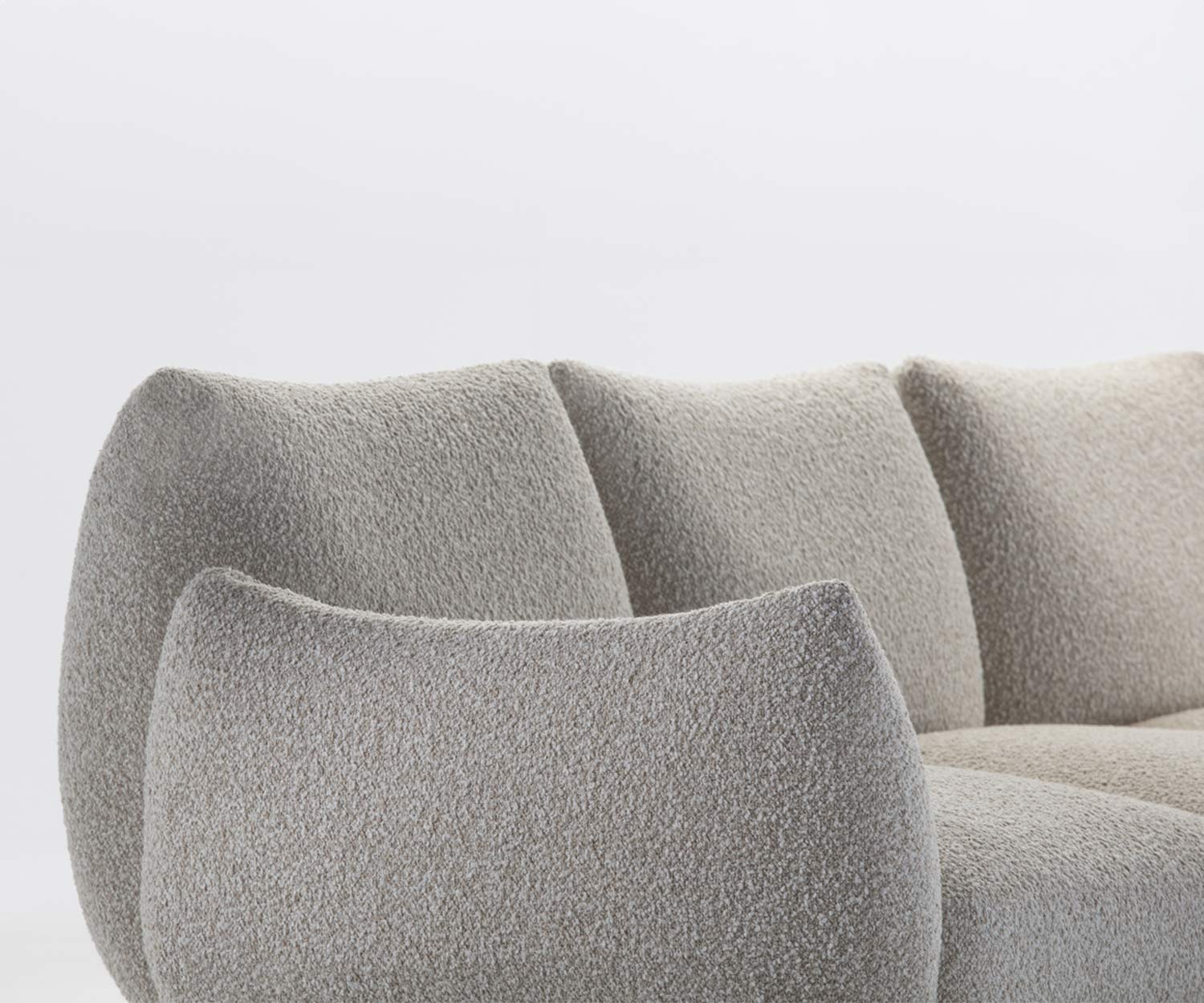 I l tessuto di rivestimento del divano di design Buffa è disponibile in 3 colori: beige bouclé, grigio chiaroo grigio scuro. Il divano Buffa è disponibile in due versioni: a 2 e a 3 posti, ciascuna con l'opzione di un bracciolo per un maggiore comfort.