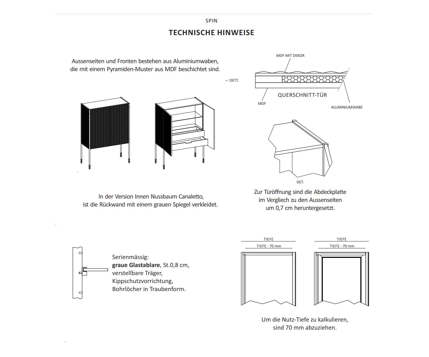 Le ante della credenza sono realizzate con un pannello in MDF di alta qualità, con frontali e fianchi realizzati con una robusta anima in alluminio a nido d'ape. Il corpo della credenza Spin è disponibile in 6 colori opachi: BV3 Aqua, GR3 Beige (simile a RAL1019), GN1 Bianco (simile a RAL9016), GN5 Grigio chiaro (simile a RAL7040), GN7 Grigio scuro (simile a RAL7043) e WN9 Nero (simile a RAL9017).
