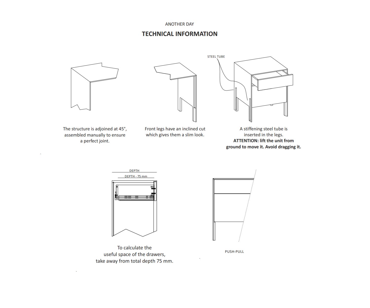 La struttura della cassettiera Another Day è unita con un angolo di 45 gradi, che non solo garantisce un aspetto estetico gradevole, ma aumenta anche la stabilità del mobile. Questa lavorazione precisa garantisce un collegamento perfetto che offre resistenza e qualità al tatto.