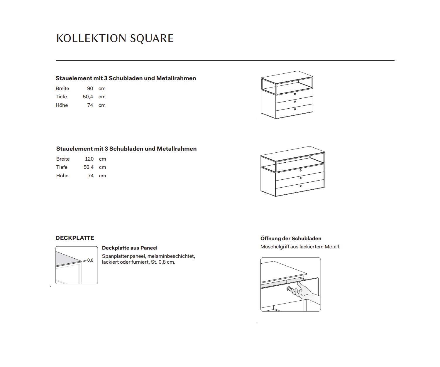 La cassettiera Square di Novamobili ha un design modulare e convince per l'alta qualità dei materiali e la precisione della lavorazione. Combina elementi di contenimento chiusi con vani aperti in strutture metalliche e offre numerose opzioni di personalizzazione.