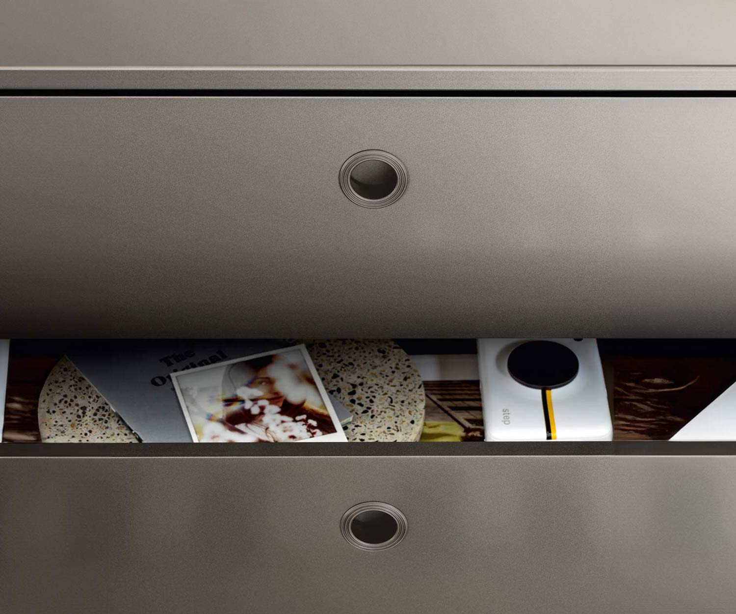 . Il pannello di copertura, il pannello posteriore e il pannello inferiore dell'elemento contenitore aperto, nonché la struttura metallica dell'elemento contenitore e le maniglie dei cassetti sono disponibili nello stesso colore opaco della scocca.