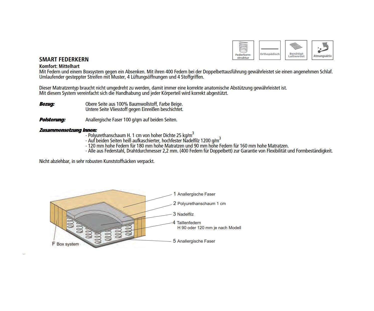 I mobili sono realizzati in truciolato di alta qualità a bassa emissione di formaldeide (certificazione ecologica CARB2). Il truciolato è rifinito con melamina bianca su entrambi i lati. I piedi sono in nylon, la base è costituita da doghe in compensato di faggio. Il rivestimento del materasso è in cotone, l'imbottitura è in fibre anallergiche, mentre il materasso contiene molle in acciaio e poliuretano espanso.