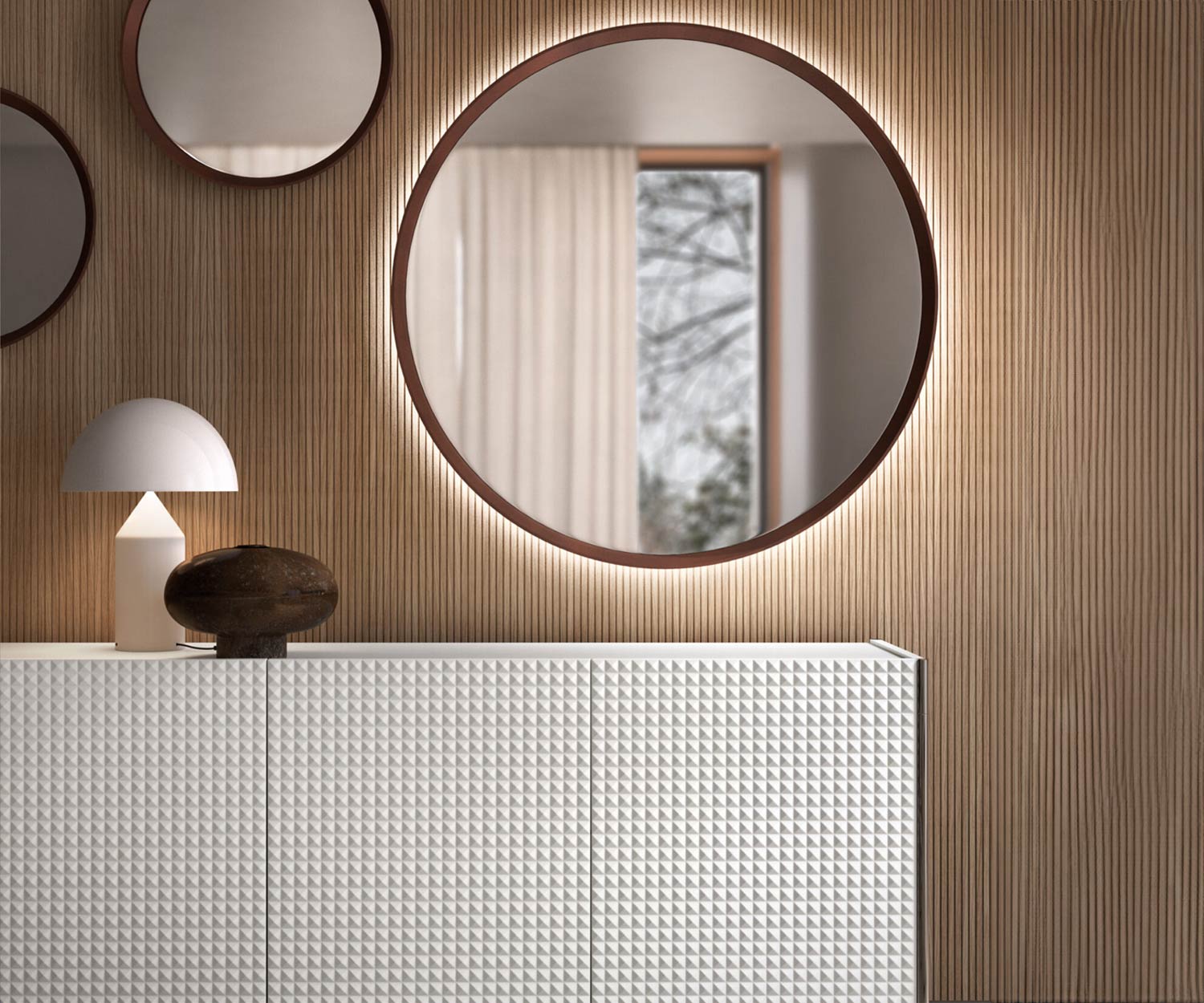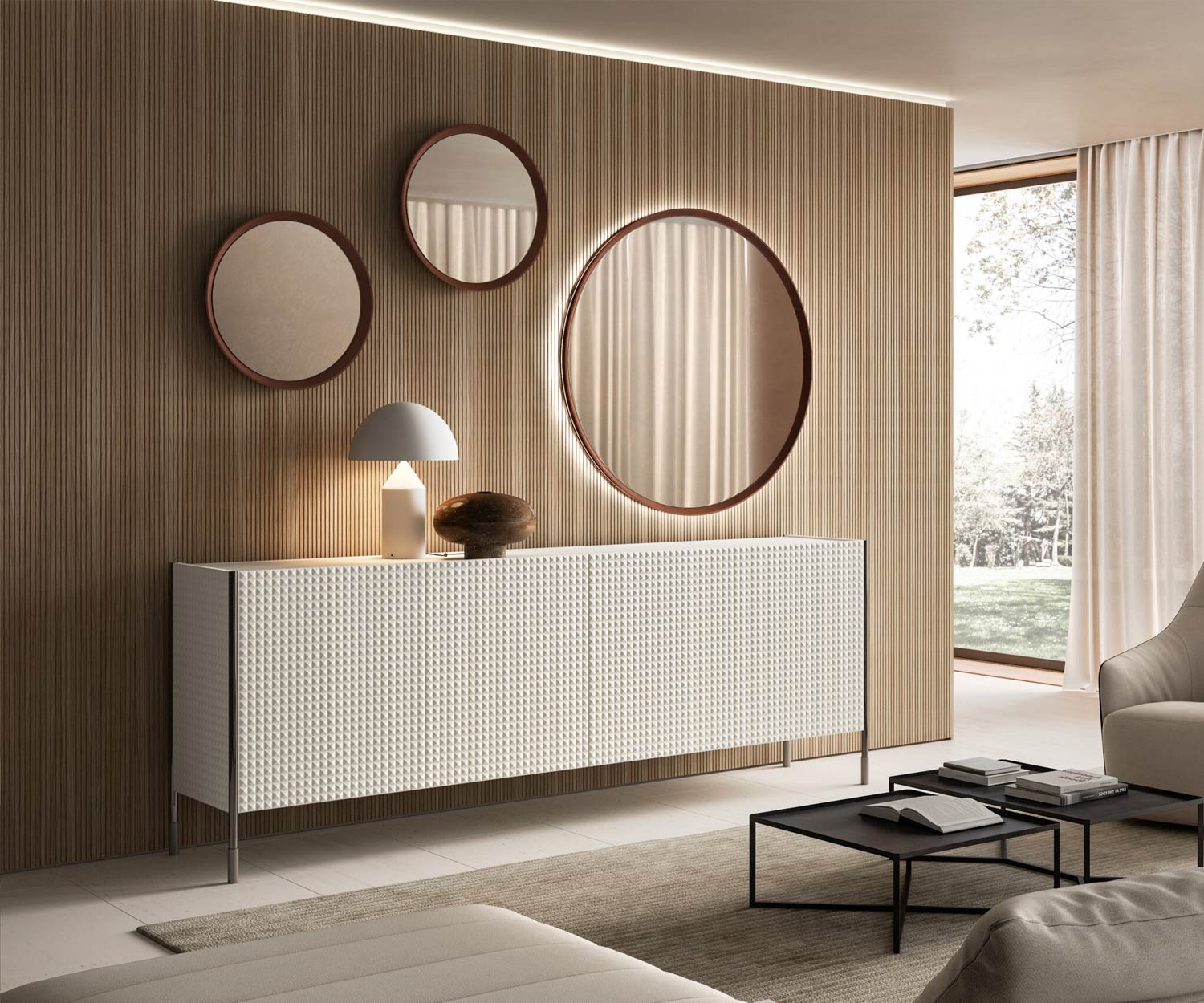 Questa struttura unica conferisce un'atmosfera di lusso esclusivo a un soggiorno moderno. La credenza Spin si abbina al design della credenza Capo d'Opera Spin.