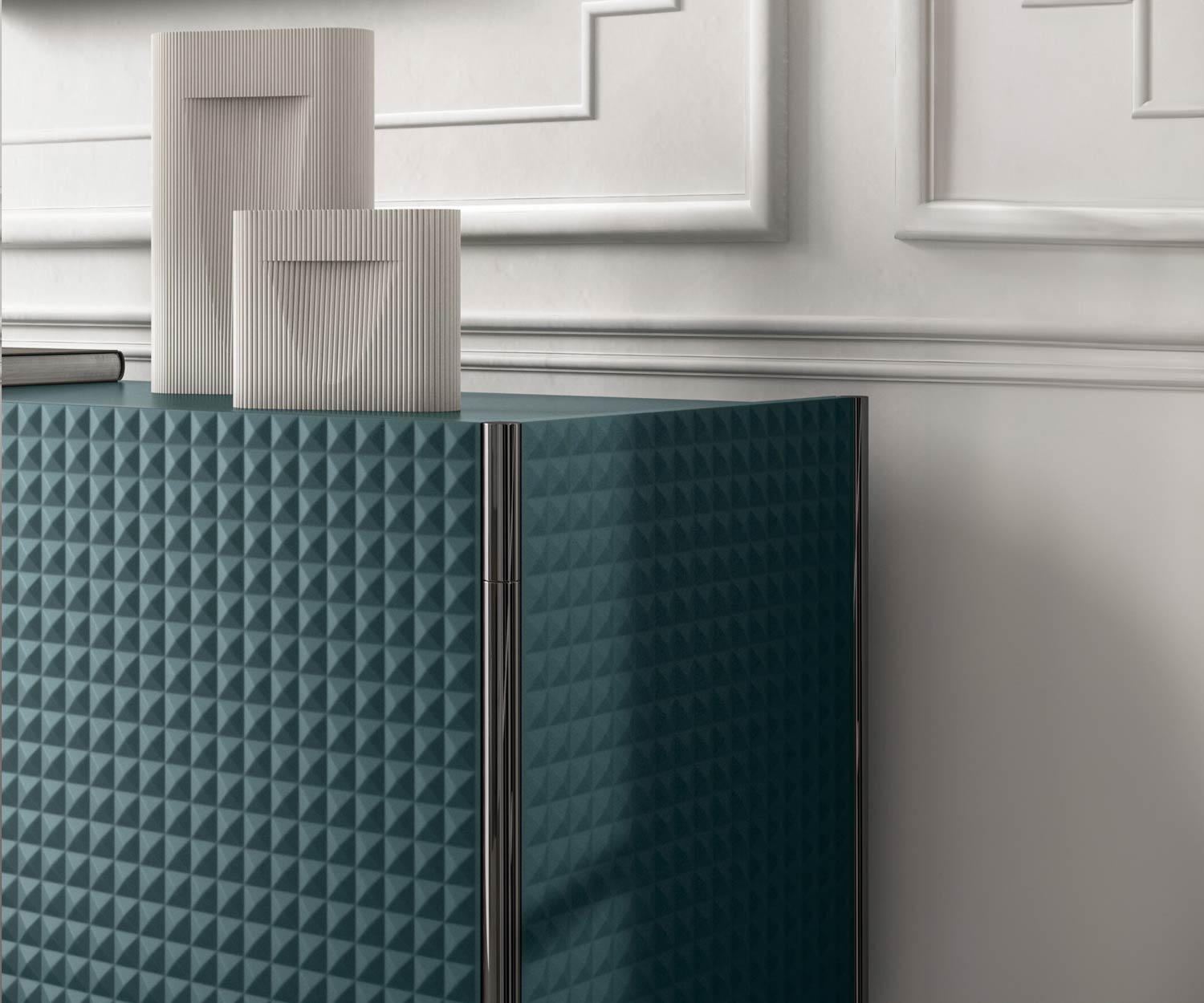 La scocca della credenza Capo d'Opera Spin è laccata opaca all'interno in tinta con i frontali e i fianchi. Le ante della credenza sono realizzate con un pannello in MDF di alta qualità, mentre i frontali e i fianchi sono realizzati con una stabile anima in alluminio a nido d'ape.