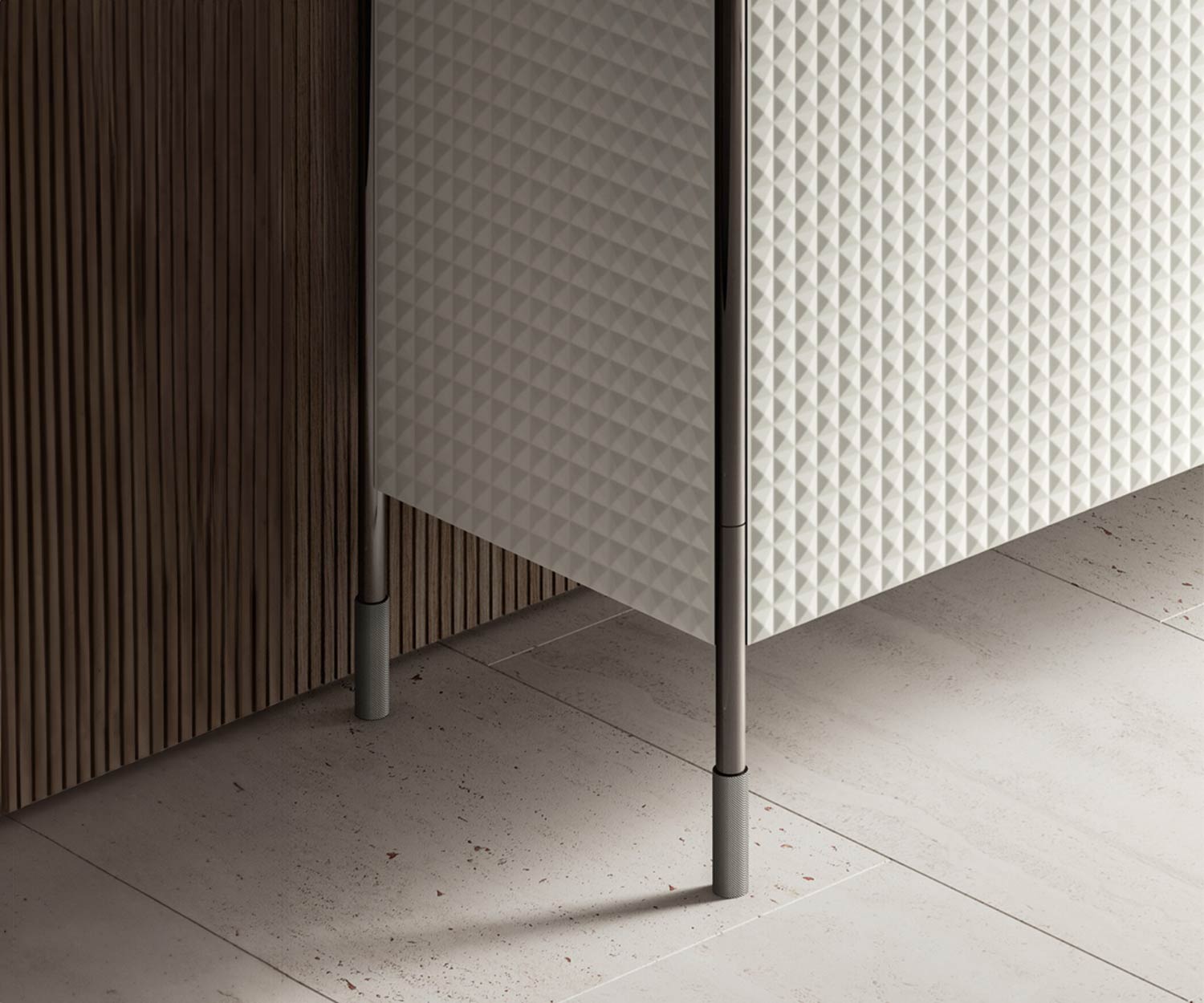 La piastra di copertura è più bassa di 0,7 cm rispetto ai lati esterni per l'apertura dell'anta. Per evitare che la credenza si pieghi, Sulla piastra di base sono montati due tubi di rinforzo. Sotto la piastra di copertura è possibile installare una luce LED con cavi di alimentazione e sistema di accensione. conduttori di energia e sistema di accensione (sovrapprezzo per il sistema di illuminazione a LED) possono essere richiesti come opzione.