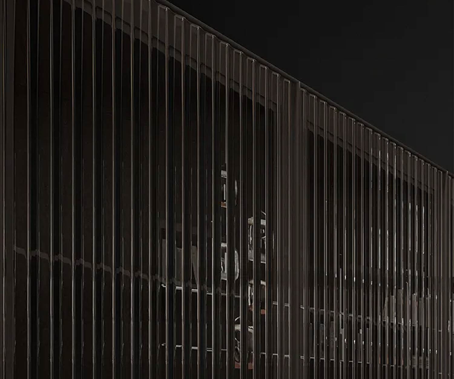 Le ante in vetro scanalato creano un'emozionante texture superficiale e creano particolari accenti nell'ambiente con i loro sofisticati giochi di luce.