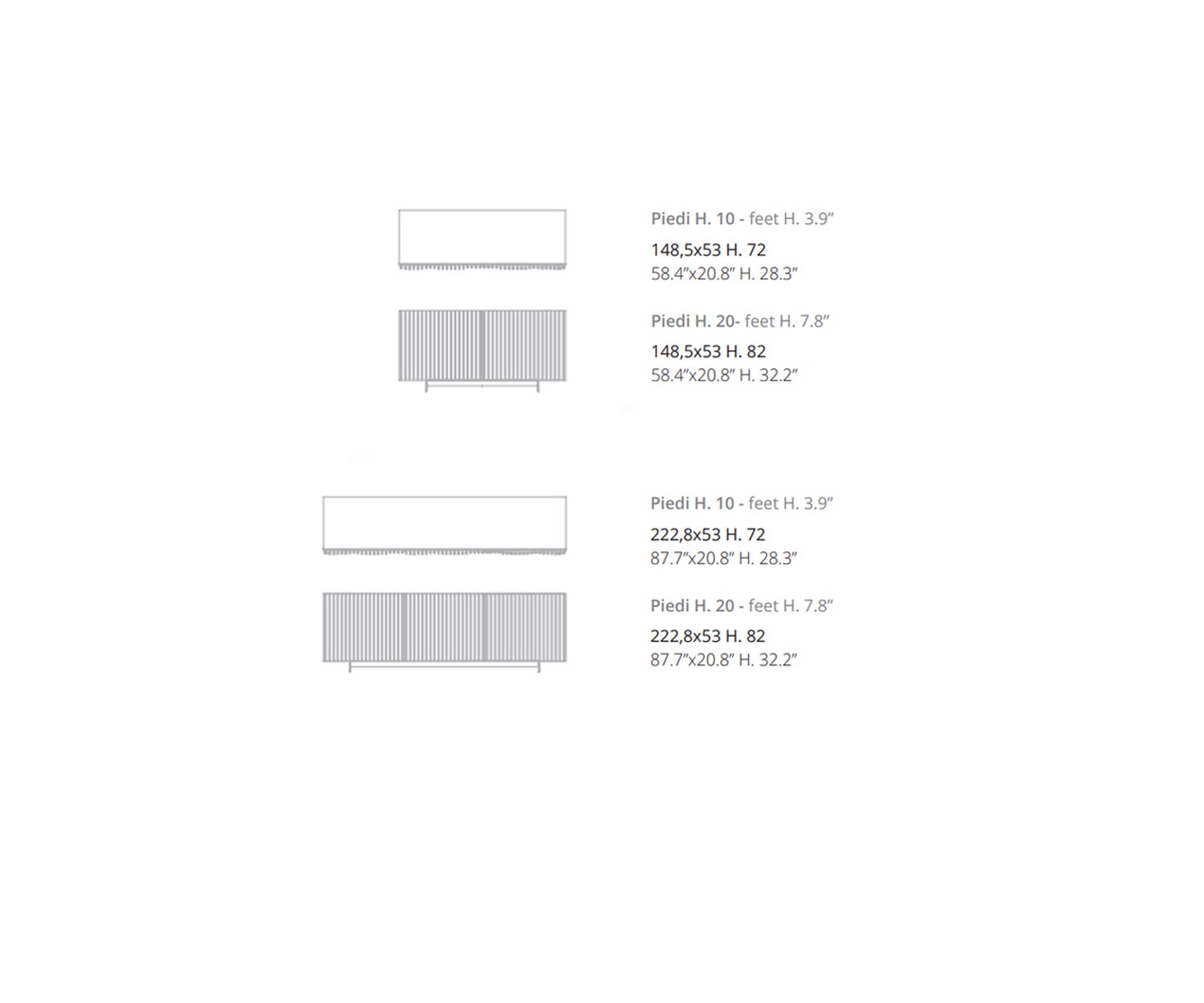 L 148,5 cm / A 82 cm / P 53 cm / Piedi H 20 cm (con 2