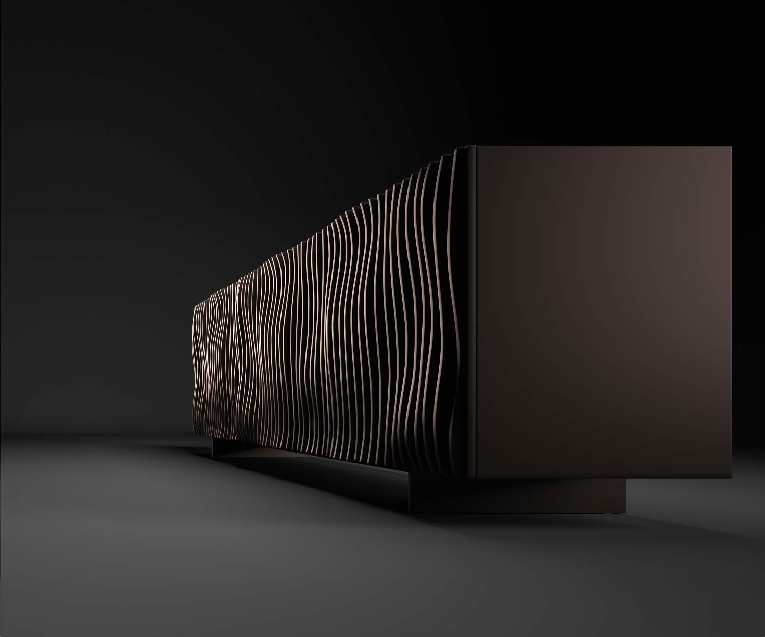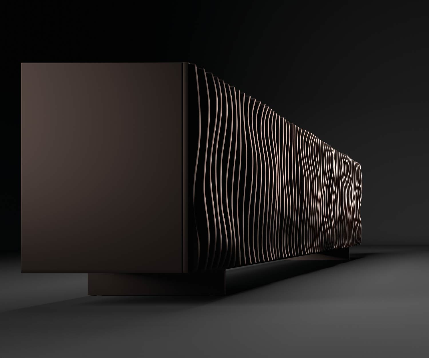 Il frontale e la scocca della credenza di design Onda di Ozzio sono disponibili nei suggestivi colori laccati bronzo opaco o grigio Ardesia opaco . Le gambe in metallo sono laccate in bronzo opaco o grafite opaco in tinta con la scocca e il frontale.
