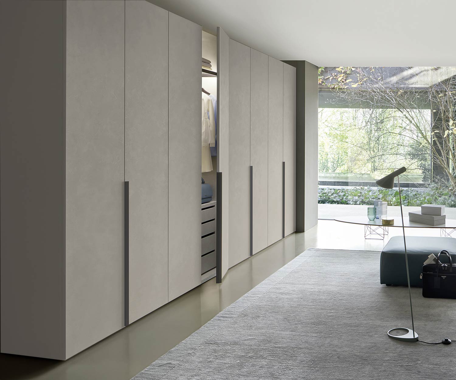 Livitalia Liscia è un armadio dal design particolarmente minimalista che si distingue per l'insolito aspetto a spatola di cemento. Questo non solo conferisce all'armadio un aspetto particolare, ma lo rende anche più resistente ai graffi e ai segni dell'usura quotidiana.