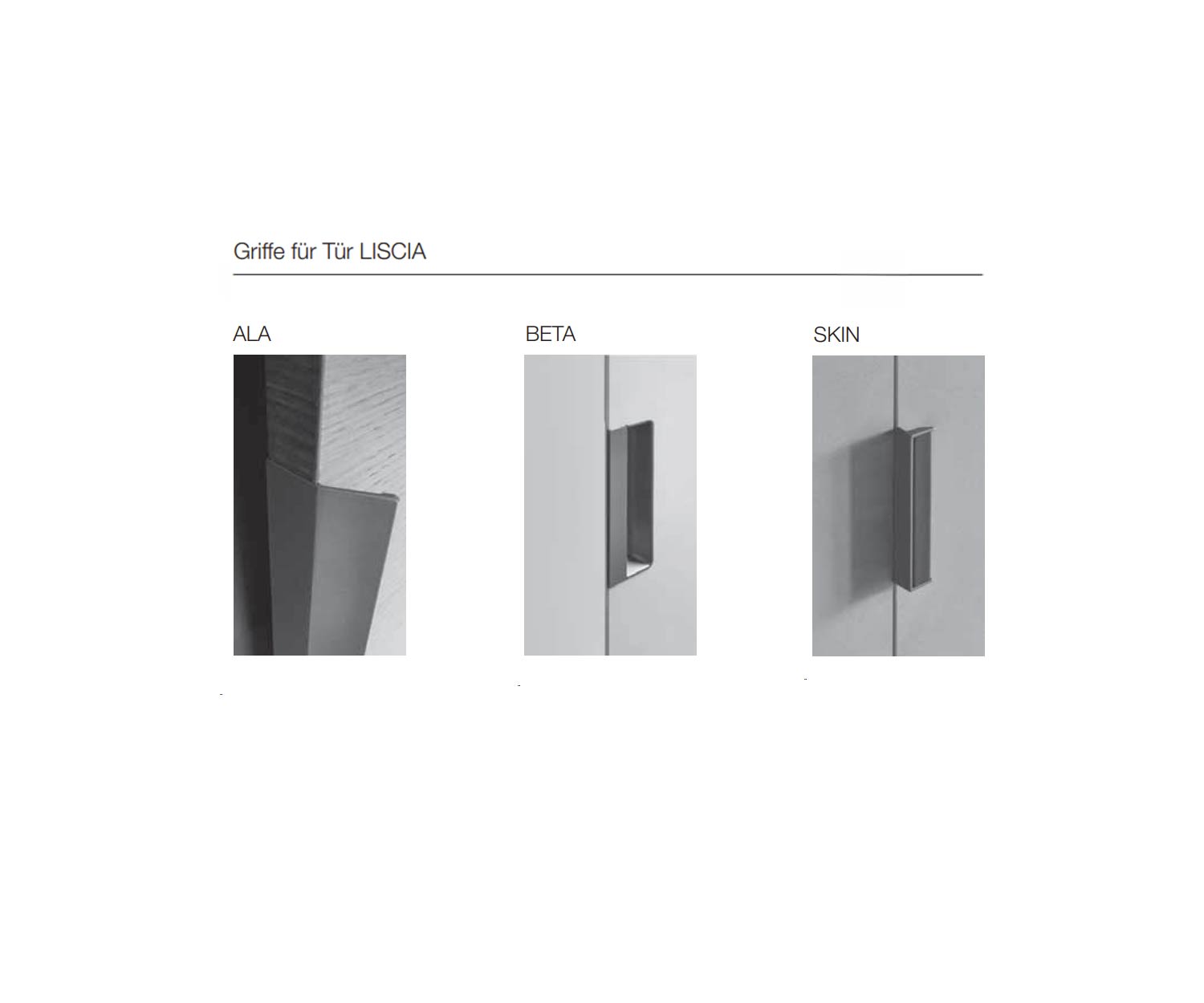 Il colore standard dell'armadio Liscia è il look spatolato. Si tratta di una superficie molto resistente ai graffi che sembra essere stata riempita. L'interno ha lo stesso aspetto. Su richiesta, la cassa e il frontale possono essere laccati in uno dei 4 colori opachi senza l'aspetto spatolato. È possibile scegliere tra: Bianco (simile a RAL9016), nero (simile a RAL9011), grigio scuro (simile a RAL7043) o grigio chiaro (simile a RAL7044). Colori RAL speciali sono disponibili su richiesta. Finitura lucida disponibile su richiesta.