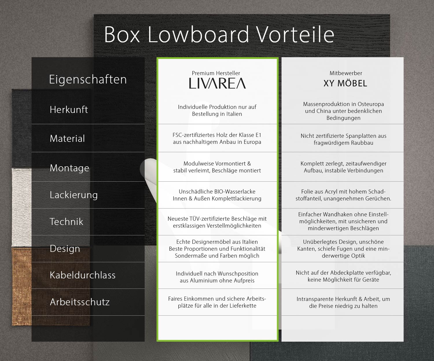 Ich habe mich für ein schwarz mattes Lowboard in der Breite von 2,40 Metern entschieden und bin begeistert! Durch die schwebende Optik und matte Lackierung ist das Board der Hingucker im Wohnzimmer. Die Verarbeitung ist sehr hochwertig, die Kabeldurchlässe konnte ich individuell bestimmen und die Lieferung folgte wie beschrieben, sogar etwas schneller. Ich würde es sofort wieder kaufen.