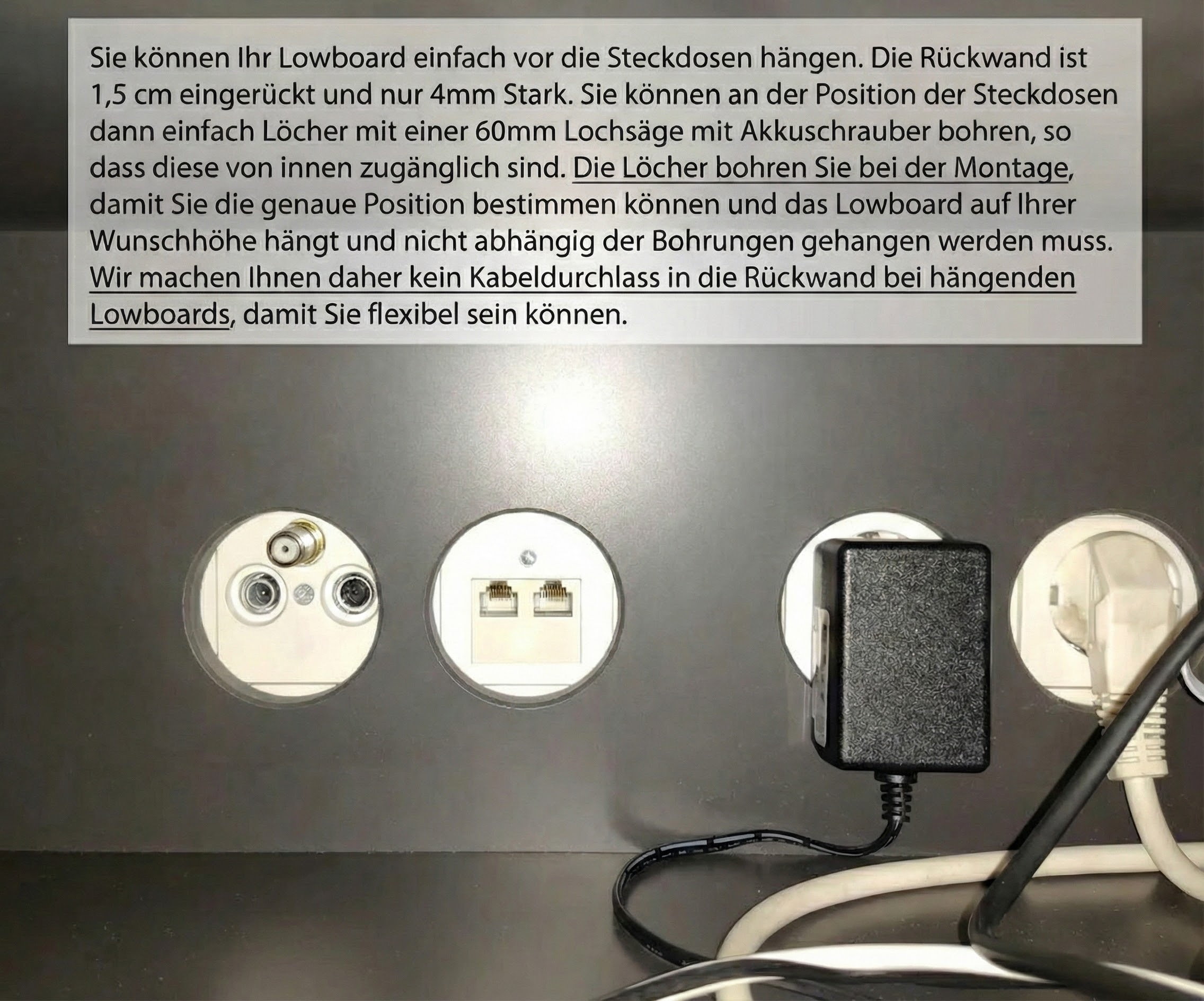 Ich habe mich für ein schwarz mattes Lowboard in der Breite von 2,40 Metern entschieden und bin begeistert! Durch die schwebende Optik und matte Lackierung ist das Board der Hingucker im Wohnzimmer. Die Verarbeitung ist sehr hochwertig, die Kabeldurchlässe konnte ich individuell bestimmen und die Lieferung folgte wie beschrieben, sogar etwas schneller. Ich würde es sofort wieder kaufen.