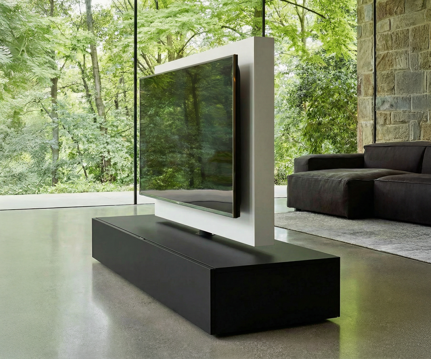 La particolarità di questo mobile di design: è completamente autoportante e girevole. La colonna TV può essere ruotata di 360°, permettendovi di guardare la televisione da ogni prospettiva – sia dal divano che dal tavolo da pranzo.