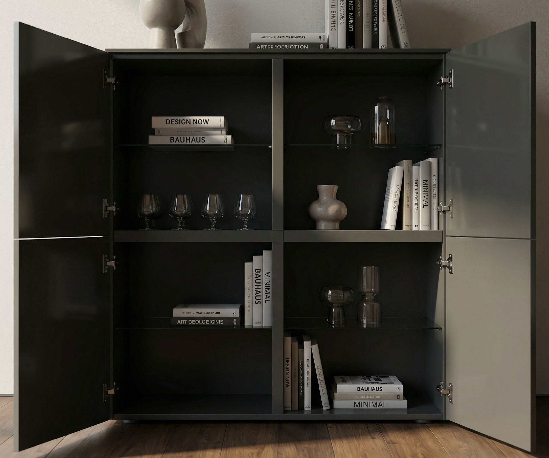 Das Livitalia Highboard Four ist in einer Palette zeitloser Farbtöne erhältlich, wahlweise in brillanter Hochglanz- oder moderner Matt-lackierter Ausführung. Sie haben die Wahl zwischen: