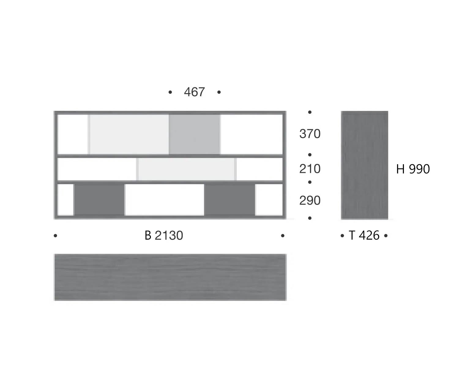 Le dimensioni esterne dello scaffale in piedi sono: L 213 cm / H 99,5 cm / P 42,6 cm.