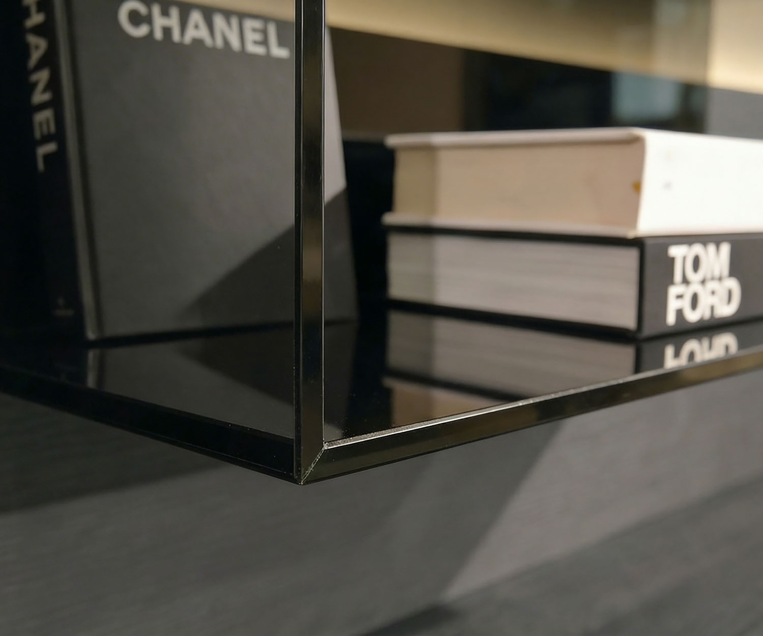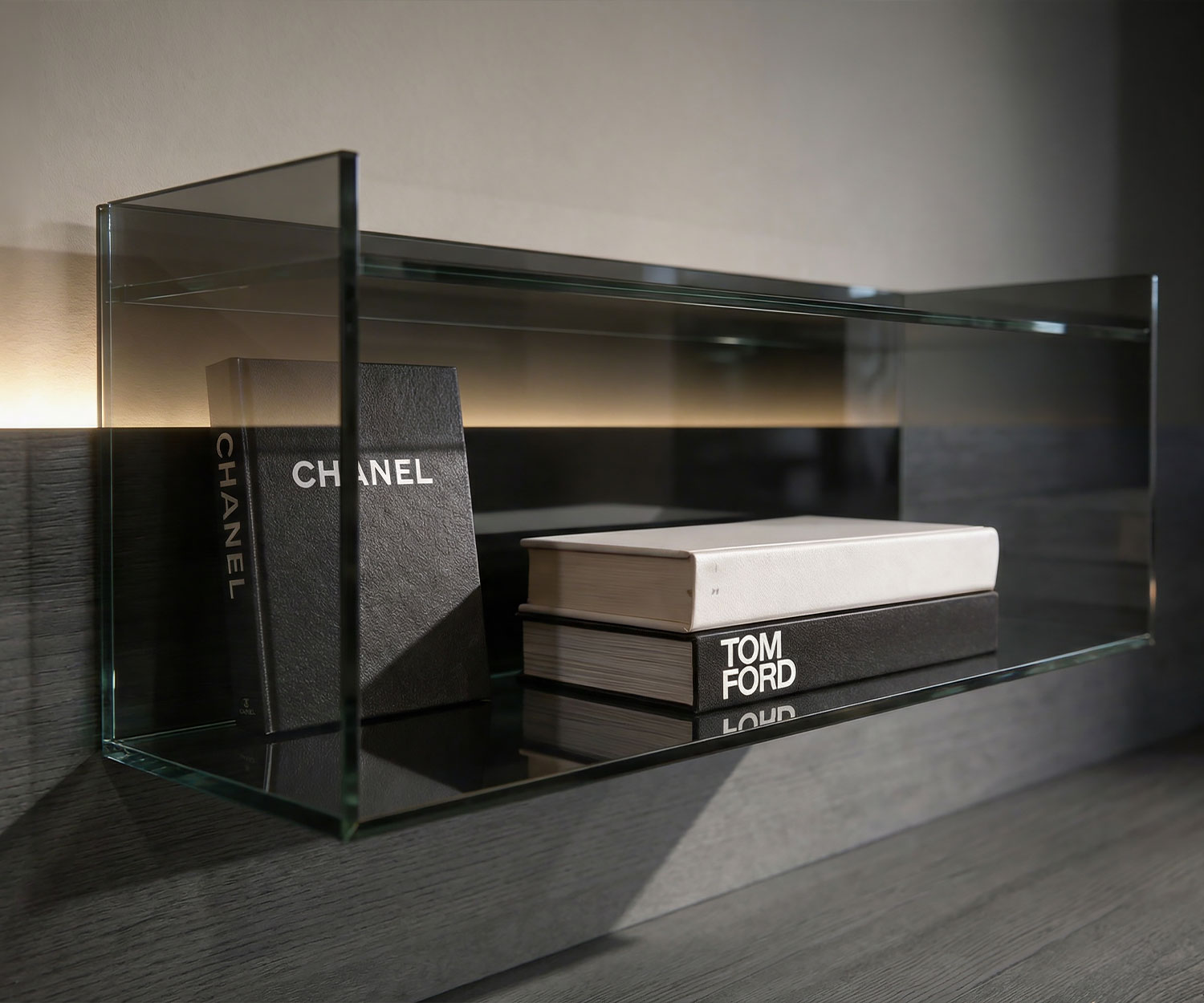 Optionales Glaswandregal: B 60 cm / H 30 cm / T 40 cm (Glasdicke 1 cm)