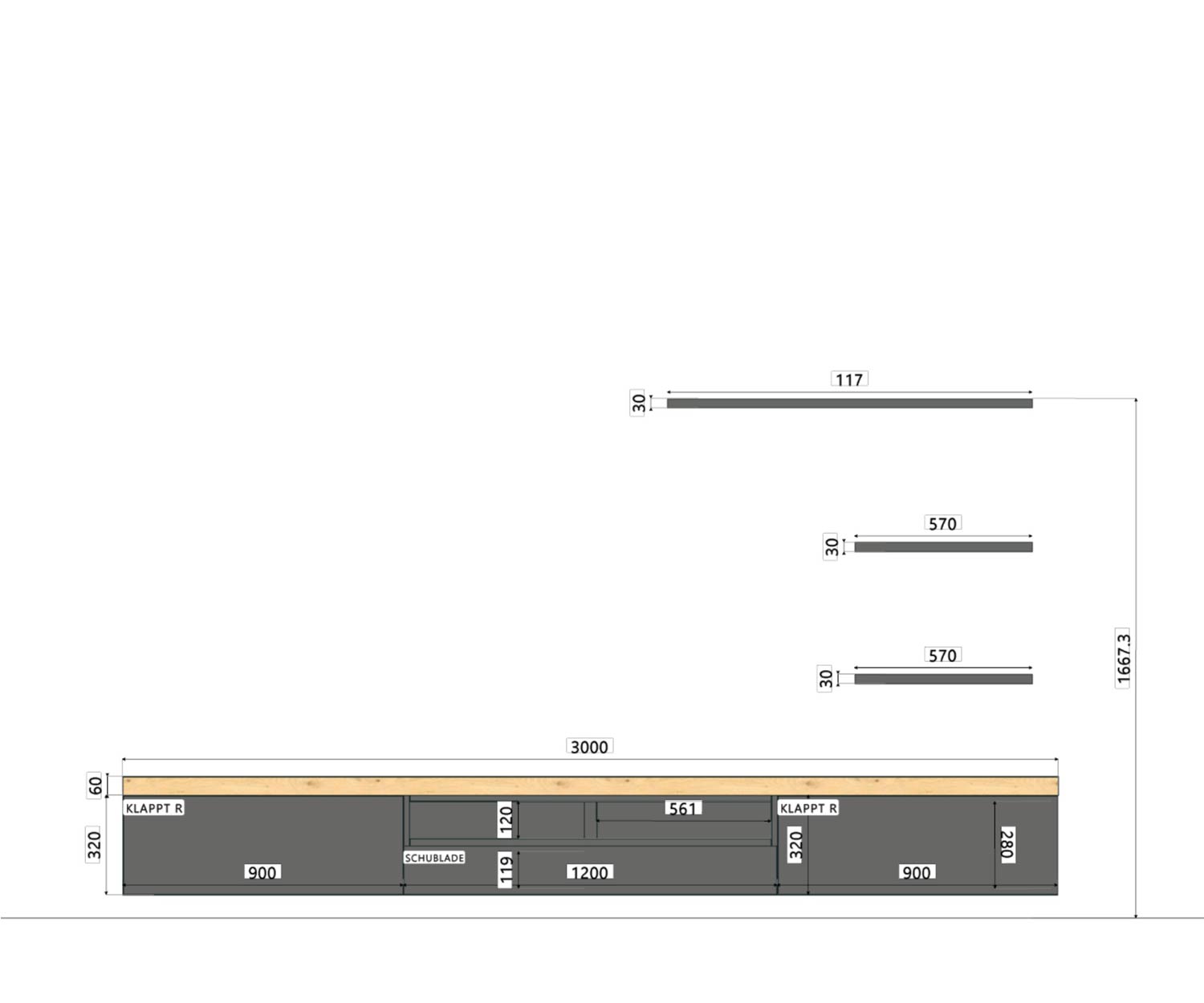 Il vostro pensile sarà laccato nel colore che preferite. Il modello mostrato è rifinito in grigio antracite opaco (simile a RAL7043) con un pannello di copertura in rovere naturale. La piastra di copertura è realizzata in vera impiallacciatura, che dà l'impressione del legno massiccio grazie alle sue venature tangibili e visibili.