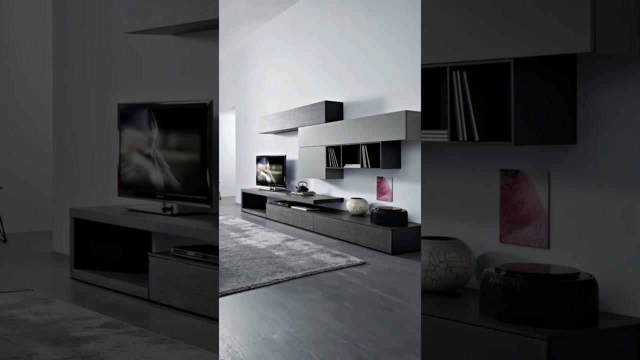 Parete attrezzata unica nel suo genere, con moderno pannello basso per TV e pannello flottante per TV in rovere Carbone. Il pannello basso offre spazio per i dispositivi elettronici. I dispositivi di alta qualità che devono rimanere visibili possono essere collocati sotto il pannello TV. Gli ampi pensili offrono un ampio spazio di archiviazione e possono essere aperti e chiusi senza maniglia premendo sulla parte anteriore. Un vano aperto offre spazio per gli accessori preferiti o per le foto di famiglia.