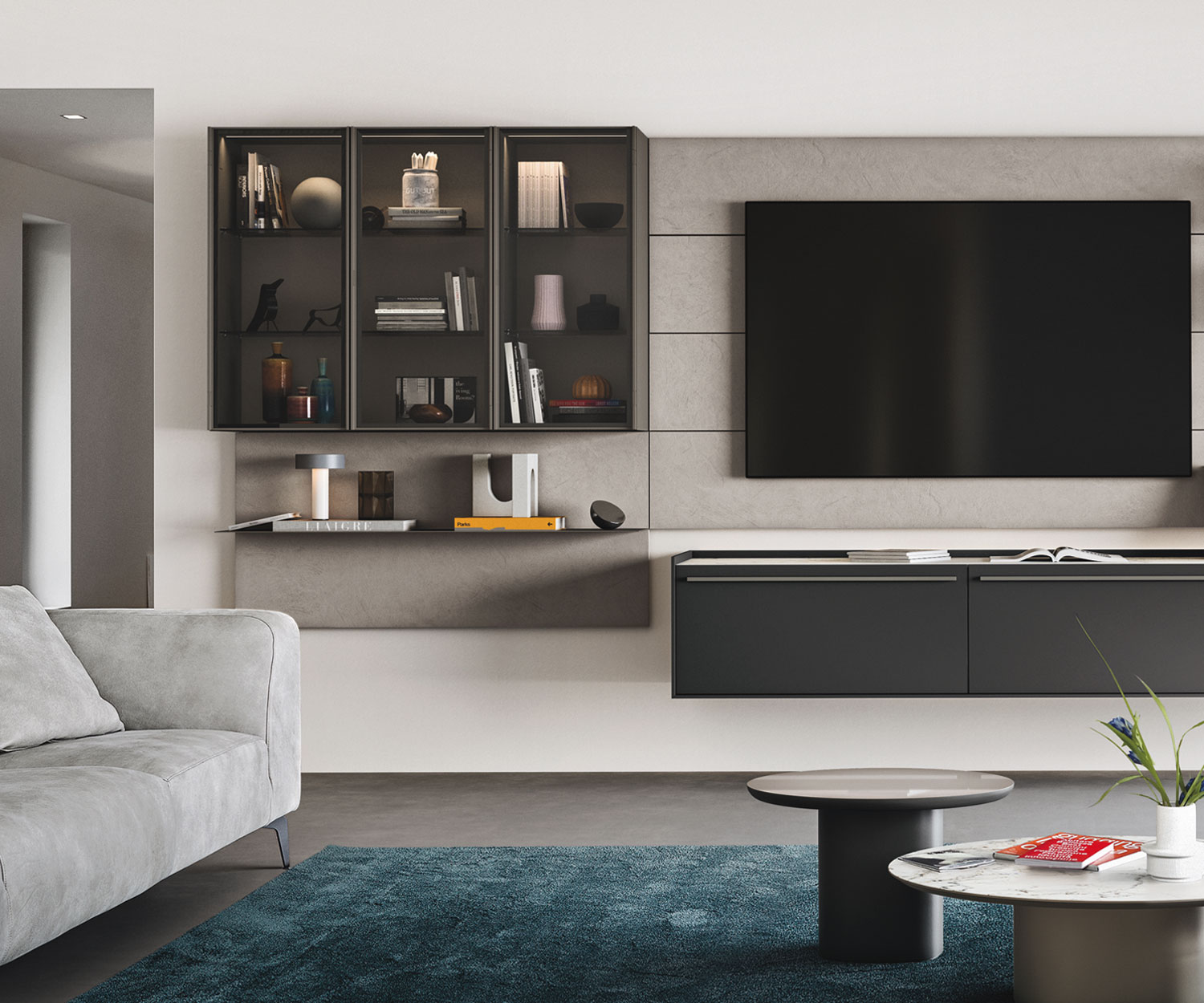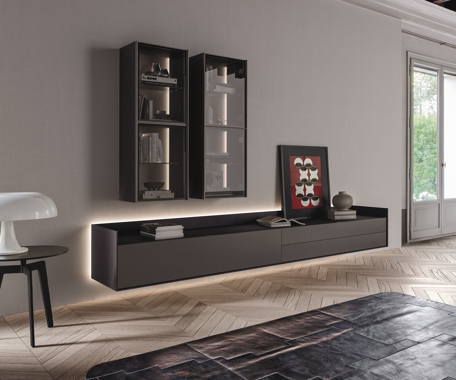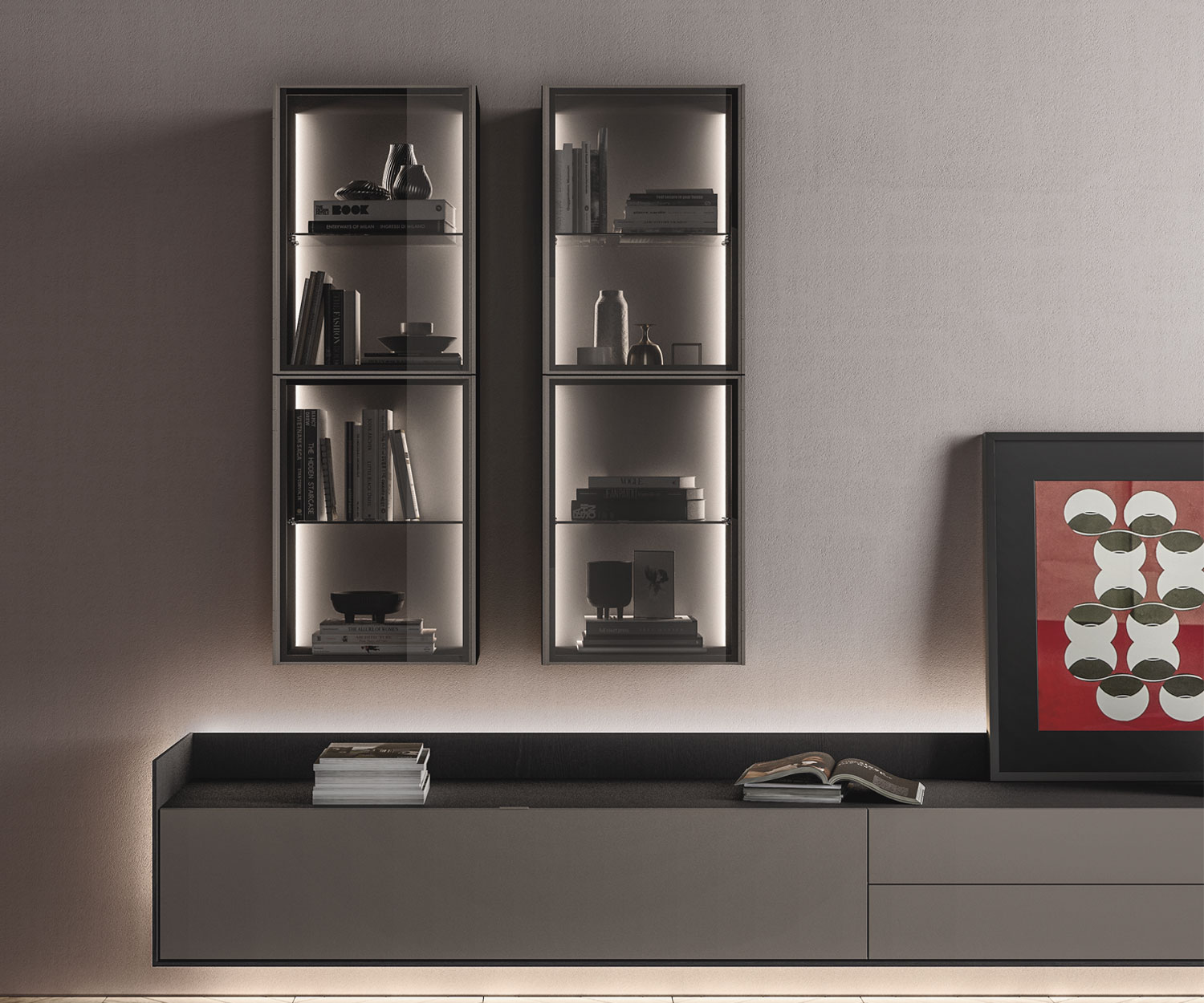 La serie comprende anche un mobile a terra in vetro Scrigno e una credenza in vetro Scrigno da abbinare al mobile sospeso in vetro di design Scrigno.