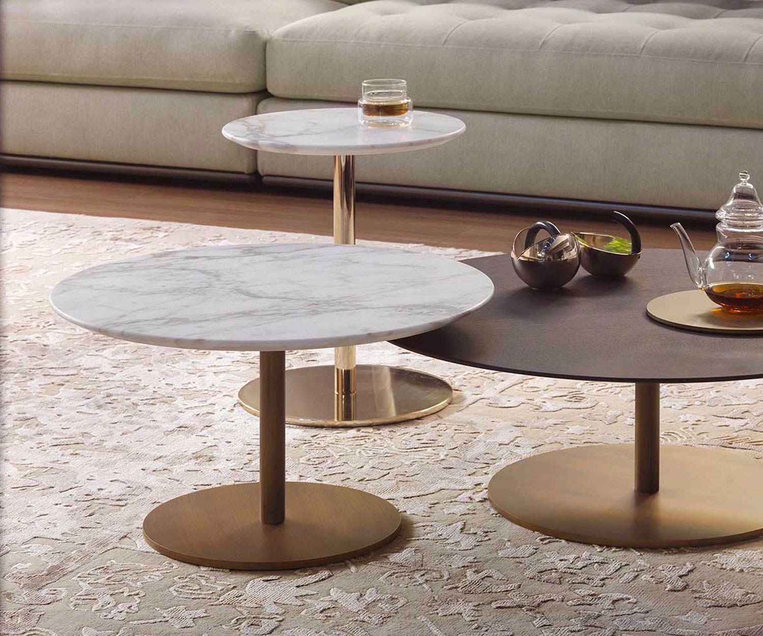 Marelli Break è un bellissimo tavolino rotondo di design per un divano o una poltrona, con piano in marmo o vetro a scelta. Il tutto poggia su una robusta struttura in metallo in vari colori.