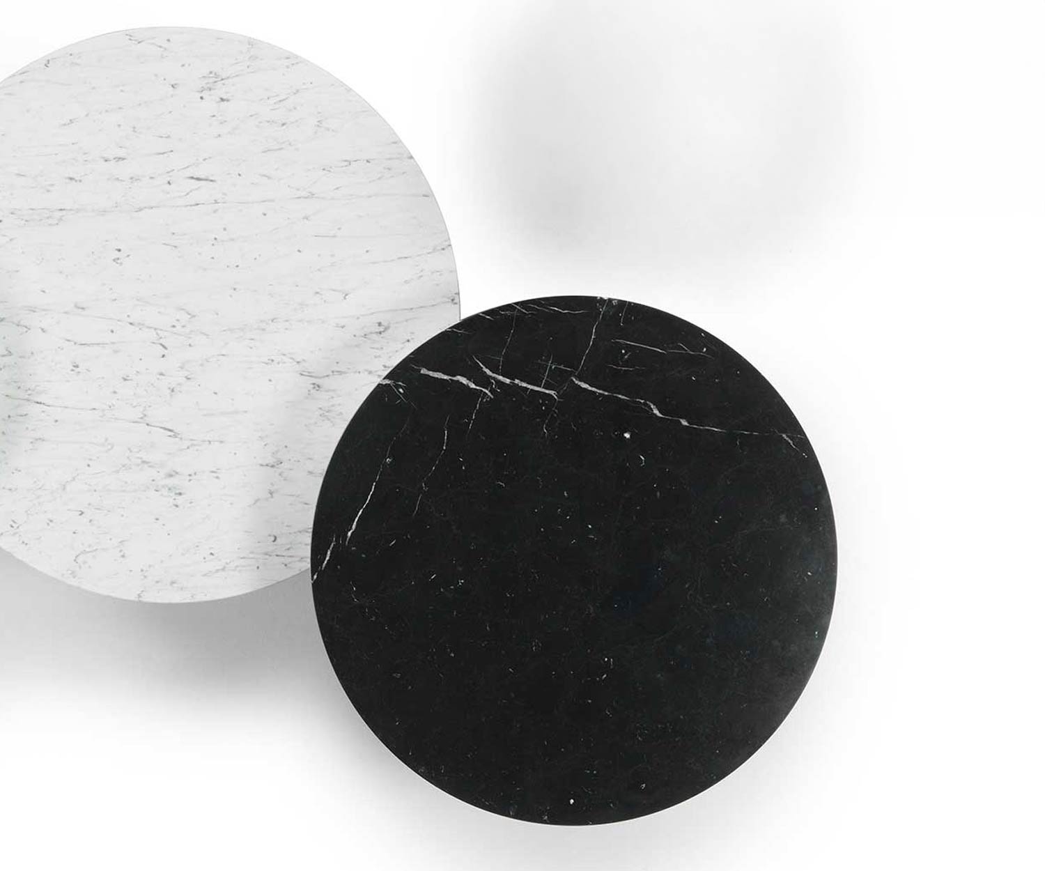 La struttura è in metallo di 10 mm di spessore e il piano del tavolo è in marmo (Carrara, Marquina, Perfetto) di 20 mm di spessore o in vetro di 10 mm. Il diametro della base è di 28 cm in ogni caso.