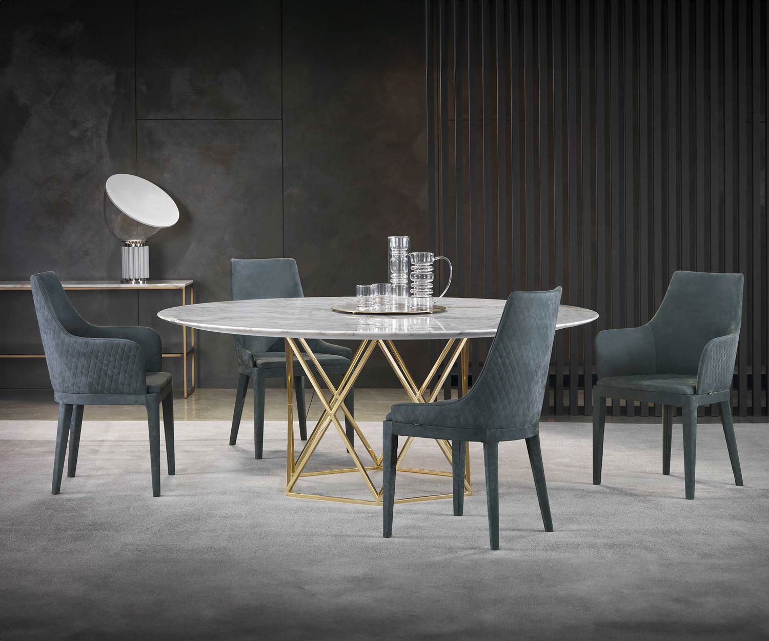 Il piano di questo tavolo da pranzo di lusso di Marelli è realizzato in pregiato marmo italiano. I tipi offerti sono: Marmo Bianco Carrara, Marmo Nero Marquinia, Marmo Marrone Emperador, Oro Calacatta o Marmo Nero e Oro. Le gambe della struttura di base sono in metallo e laccate in colore opaco o lucido. Questi colori sono disponibili in nero opaco RAL 9017, bianco RAL9016, cromo lucido, cromo nero lucido, laccato oro opaco o ottone lucido Se si sceglie l'impregnazione come opzione, questa viene eseguita in X-Stone o come rivestimento in poliestere.