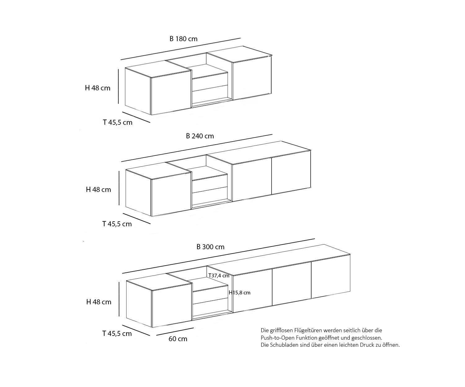 Novamobili È possibile ordinare la credenza a muro in tre versioni diverse : una versione piccola e compatta da 180 cm di larghezza, un modello leggermente più grande da 240 cm di larghezza o il modello Large da 300 cm di larghezza. La struttura degli elementi del mobile è visibile nel nostro schizzo. Novamobili Il produttore ha rinunciato alle maniglie in questa credenza di alta qualità, creando un frontale liscio e molto elegante. Le singole porte possono essere aperte e richiuse premendo leggermente sulla parte anteriore.