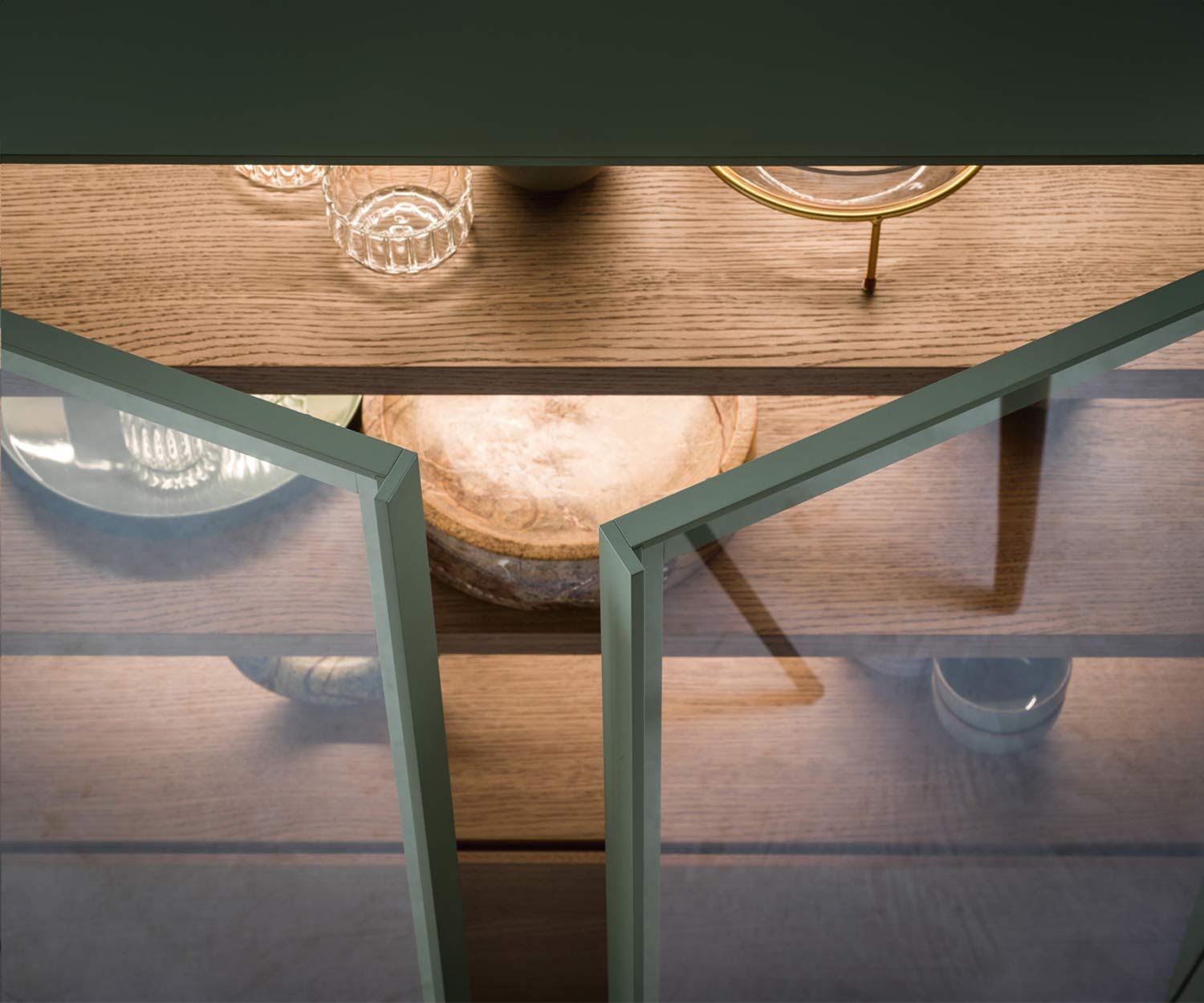 Con ante a ribalta laccate opache o con ante in vetro o ante in vetro con cassetti interni. Il telaio di base della credenza è in metallo ed è laccato in nero opaco RAL9005.