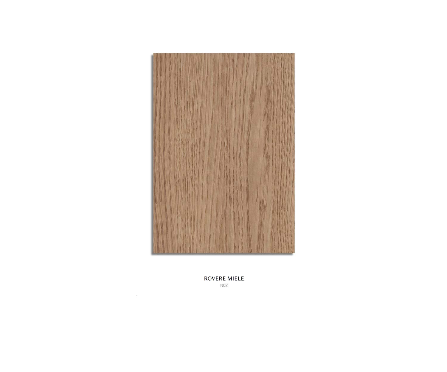 Nella versione con ante in vetro, la parete posteriore e i ripiani sono impiallacciati internamente in rovere Miele 02. La credenza è