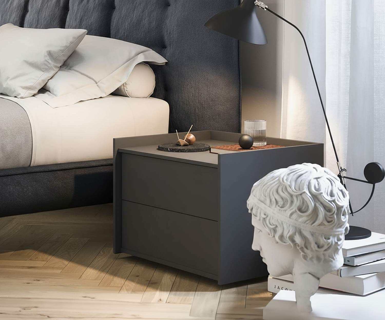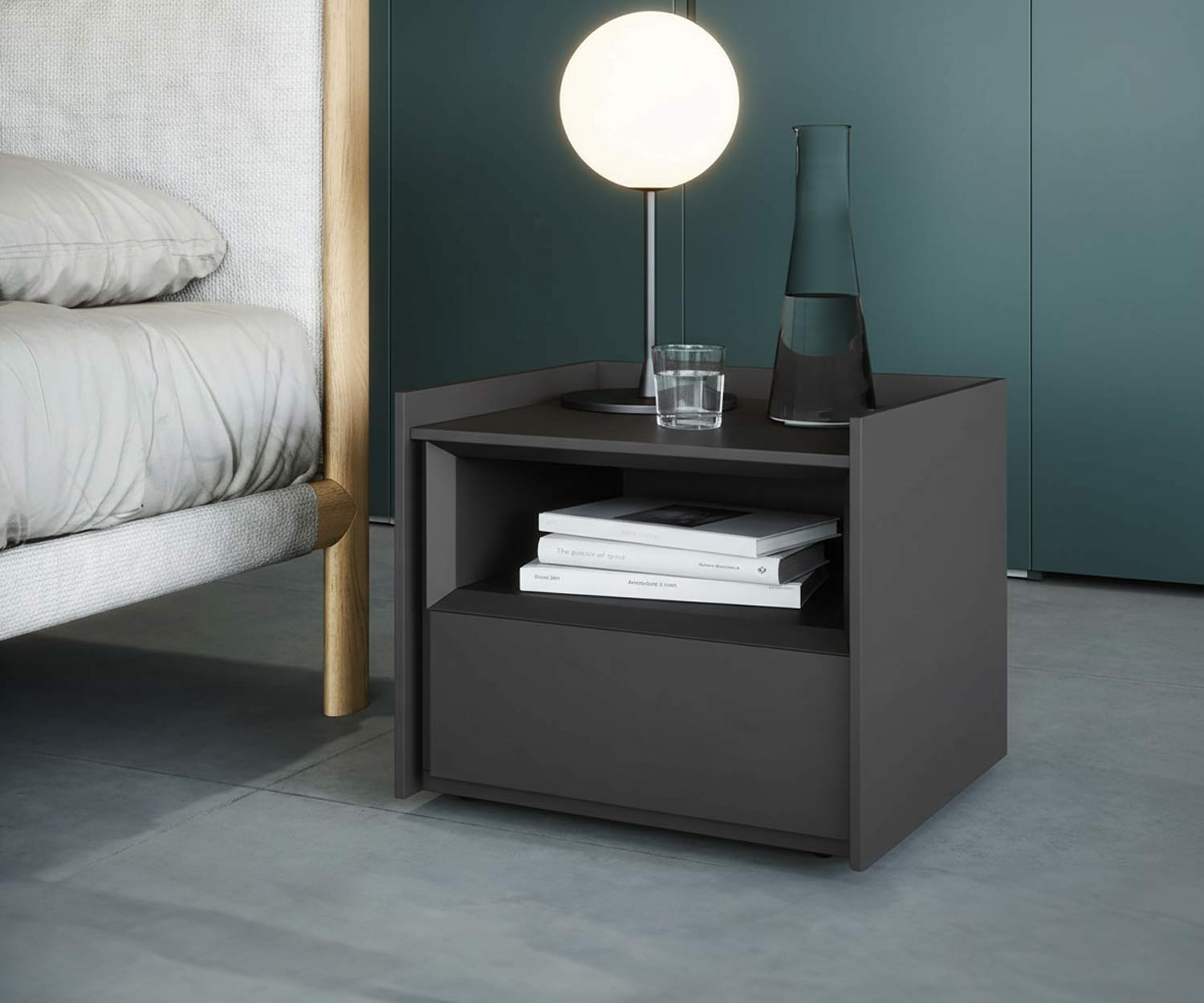 Il comodino è disponibile in 5 moderni colori opachi e 2 impiallacciature in legno. Nero opaco (simile a RAL9017), bianco (simile a RAL9016), grigio chiaro (simile a RAL7035), grigio scuro (simile a RAL7022) o beige (simile a RAL1019). Disponibile anche in rovere Rovere Chiaro N04 o noce Canaletto N04.