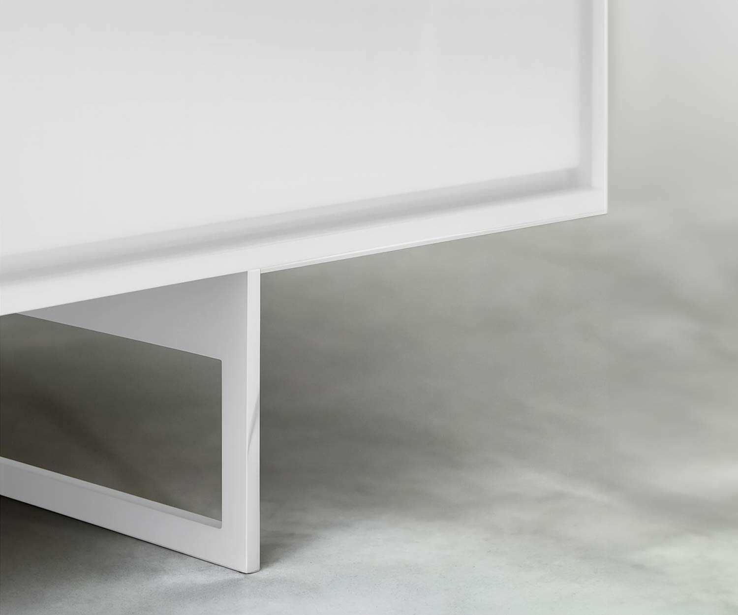 La scocca della credenza Schatten TV è realizzata in truciolato di alta qualità di classe E1 a bassa emissione di formaldeide. Questi sono rifiniti con uno strato melaminico e 8 mani di vernice ecologica. I piedi sono in alluminio cromato. Al centro della credenza è presente una terza base per garantire la massima capacità di carico.