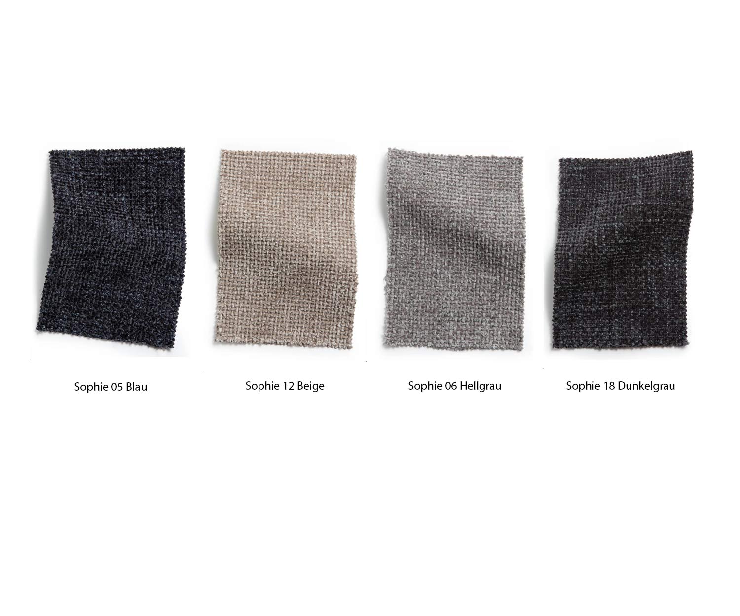 Il pregiato rivestimento Sophie è disponibile in 4 colori: beige, grigio scuro, grigio chiaro e blu. Il suo filato particolarmente ruvido crea un aspetto insolito. Su richiesta sono disponibili anche altri tessuti.