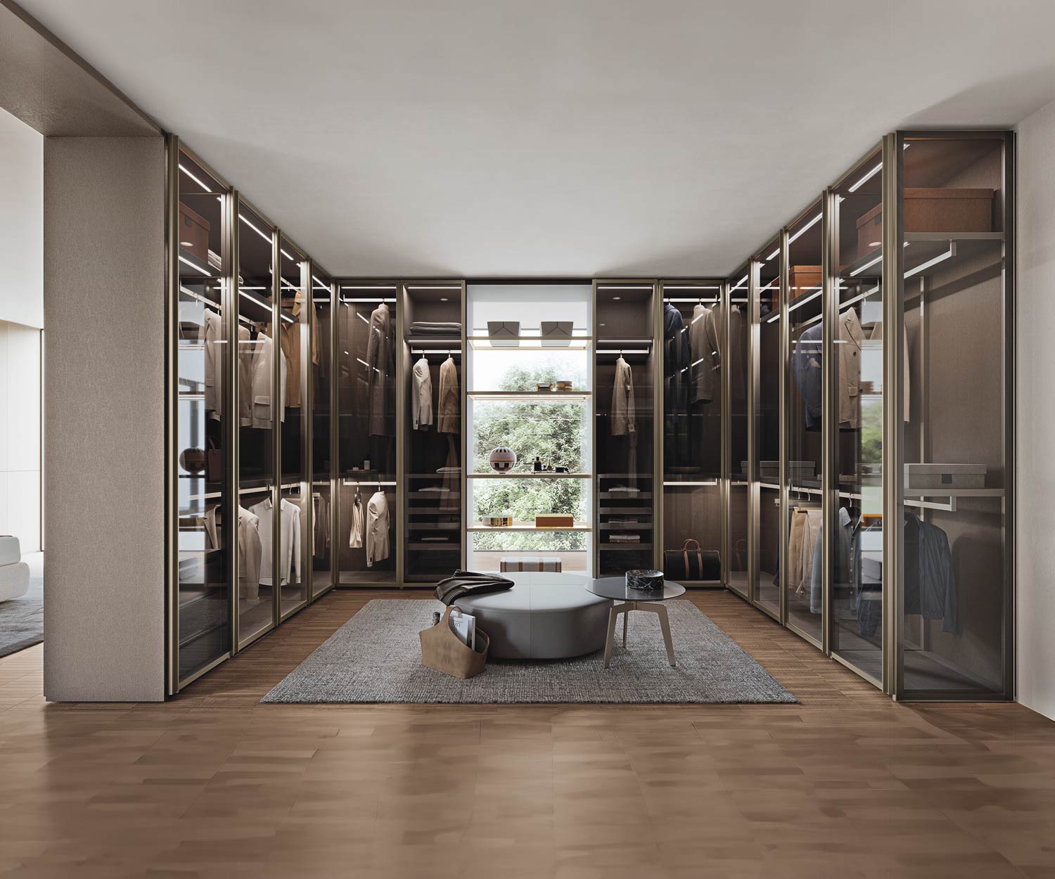 Perry è uno stravagante armadio di design con ante in vetro trasparente. L'armadio è realizzato su misura per voi in Italia. È possibile scegliere tra 8 larghezze standard da 152 cm a 402 cm. Le ante in vetro trasparente sono leggermente colorate e conferiscono agli abiti all'interno un tocco lussuoso. I telai in metallo delle ante in vetro sono di colore marrone brunito e particolarmente sottili. Ciò significa che la vista degli abiti non viene ostacolata. Con l'illuminazione interna opzionale, l'armadio con ante in vetro si rivela un vero e proprio punto di forza nella camera da letto.