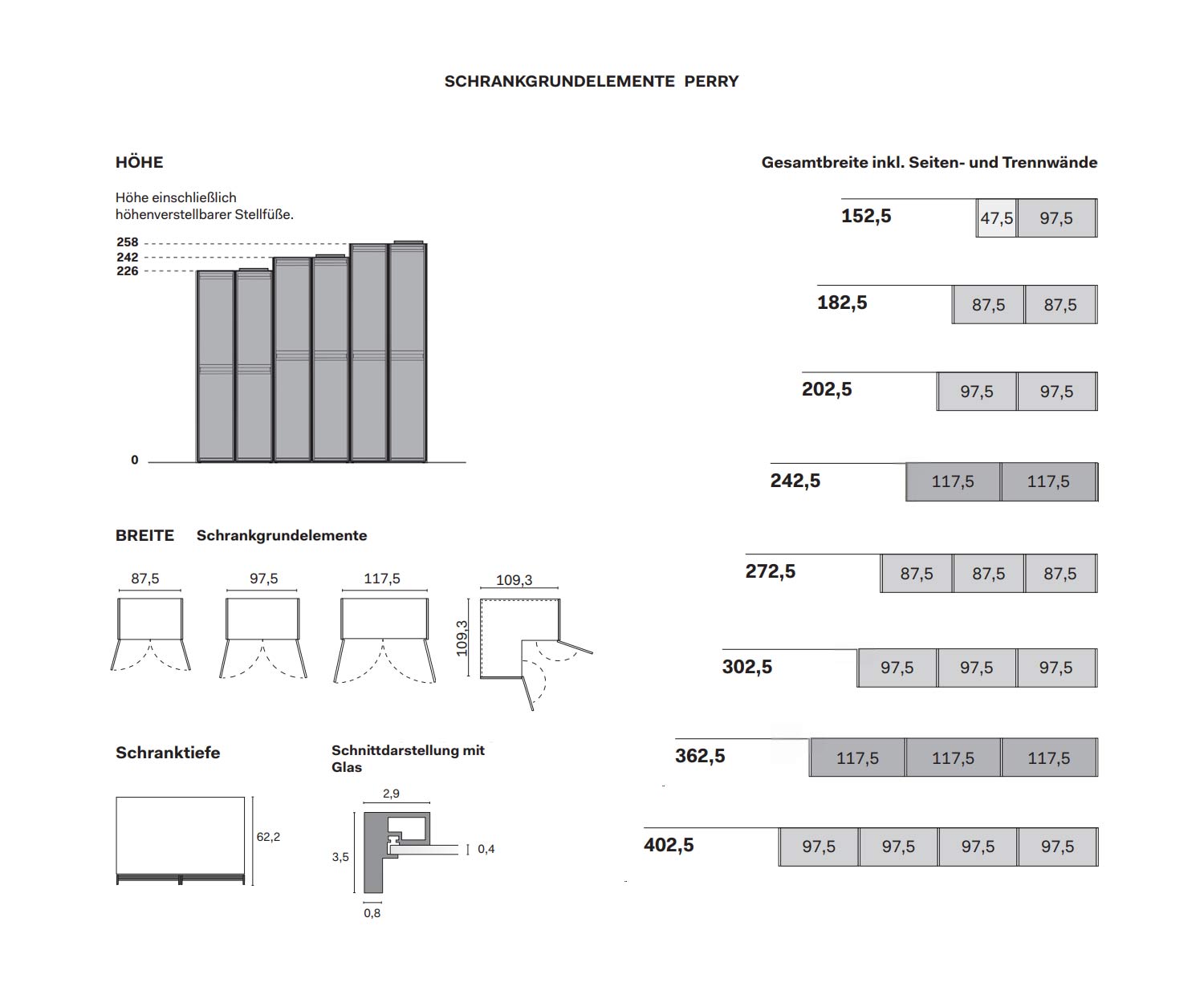 L'armadio Novamobili Perry Design viene sempre fornito con ante in vetro trasparente ma leggermente colorato. La carrozzeria può essere verniciata in 3 colori opachi a scelta. I colori disponibili sono: Bianco (simile a RAL9003), nero (simile a RAL9017), Quarzo (grigio scuro, simile a RAL7016). Gli interni sono rifiniti in grigio Oxford o noce. La superficie è leggermente strutturata e quindi più resistente ai graffi. Gli appendiabiti sono di colore marrone brunito.
