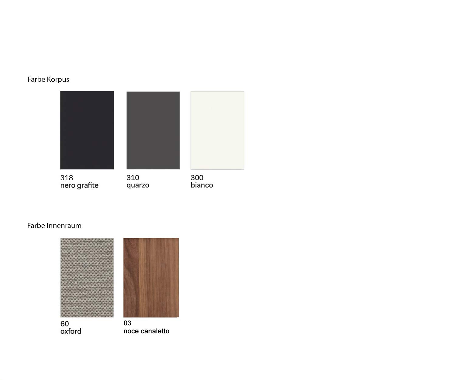 Su richiesta sono disponibili portapantaloni aggiuntivi, cassetti con chiusura ammortizzata, portacravatte, scomparti per calzini, scomparti per maglioni, illuminazione, appendiabiti abbassabili o ripiani aggiuntivi.