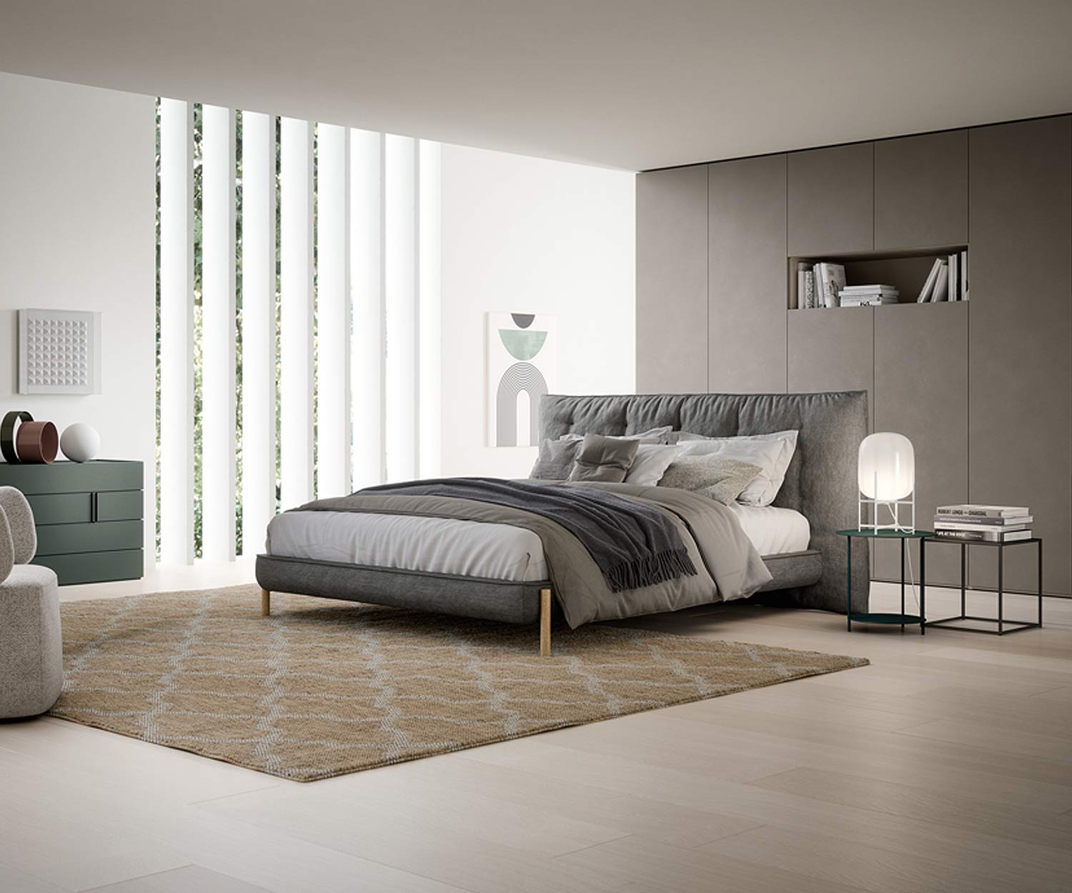 Il letto di design Tufte di Novamobili è disponibile in quattro colori di rivestimento in tessuto: nero, grigio, beige o bianco.