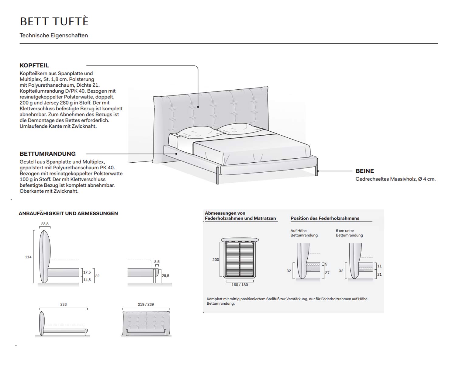La testata e il giroletto del letto Novamobili Tufte sono realizzati in multiplex (cinque strati di impiallacciatura incollati) e truciolato e contengono un'imbottitura in poliuretano espanso. Il bordo della testata è rivestito di ovatta resinata.