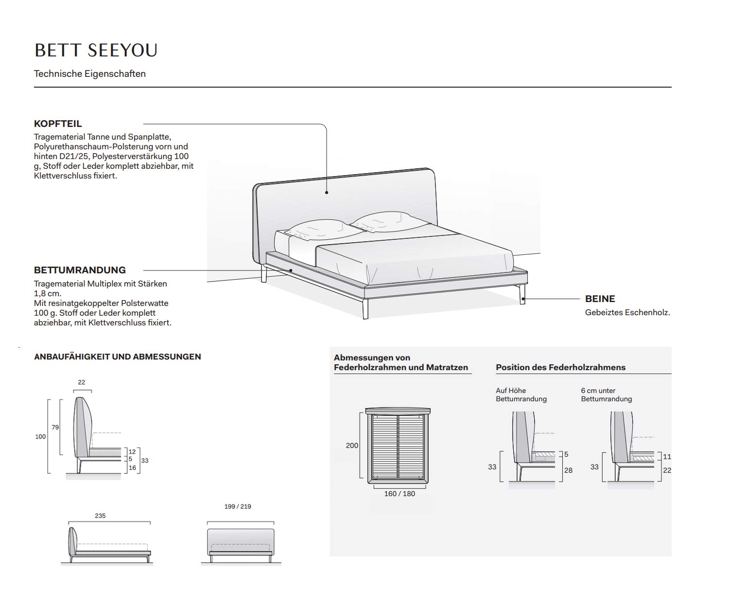 La testata del letto è realizzata in abete e truciolato come materiale di supporto. È imbottita in poliuretano espanso (D21/D25) nella parte anteriore e posteriore e ha un'armatura in poliestere di 100 g. Con rivestimento in tessuto sfoderabile.