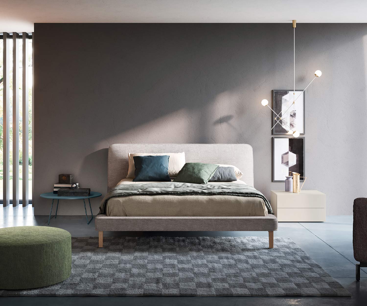 A seconda dell'arredamento della camera da letto, il letto imbottito di design Novamobili Seeyou può essere prodotto in 4 colori. Scelta di colori: Turchese, beige crema,grigio chiaro e grigio scuro.