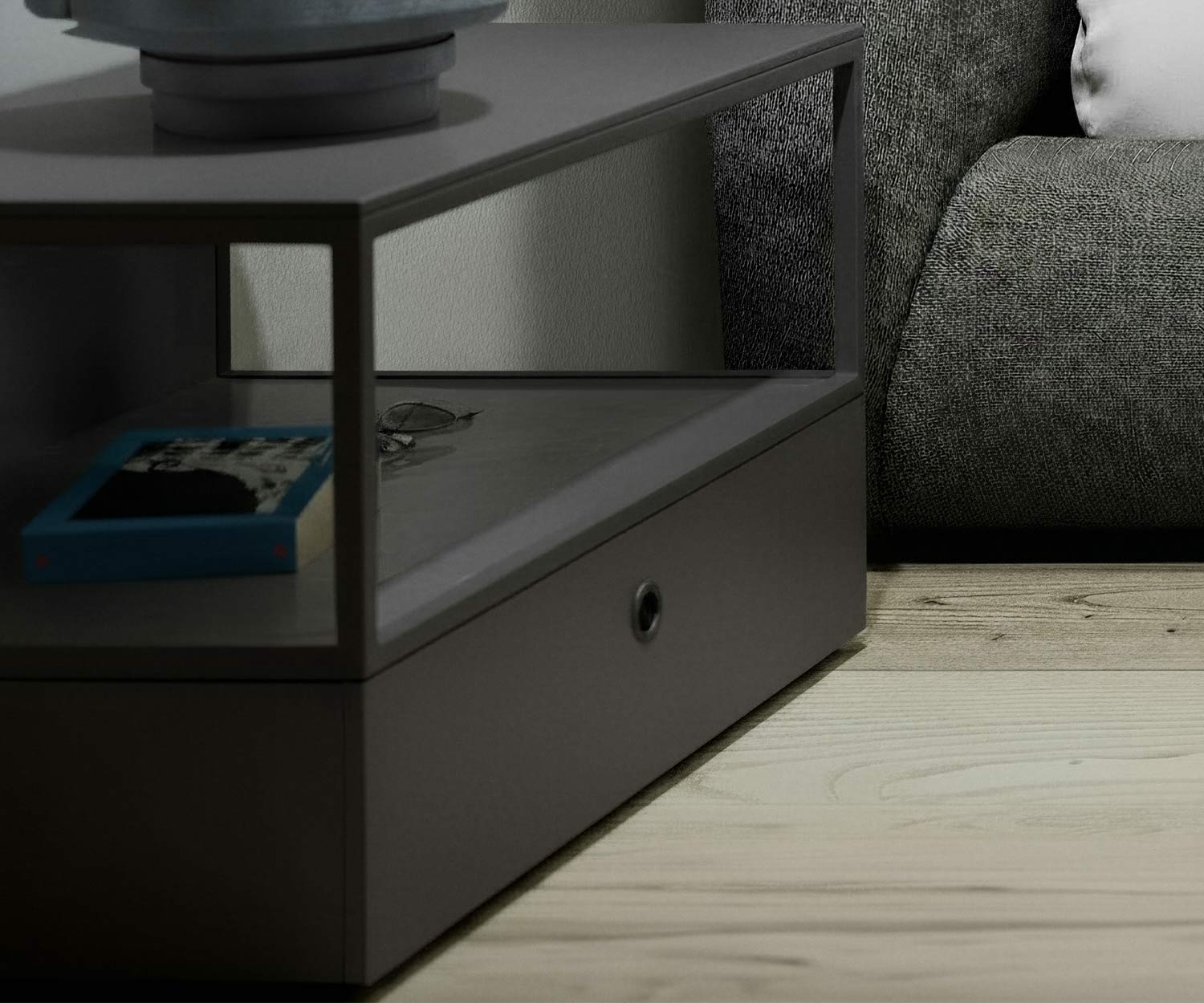 Charakteristisch für Square ist der elegante Metallrahmen, der Schubladen und offene Fächer zu einem harmonischen Gesamtbild vereint. So entsteht ein spannendes Spiel aus Struktur, Leichtigkeit und Funktion – perfekt für moderne Wohn- und Schlafräume.
