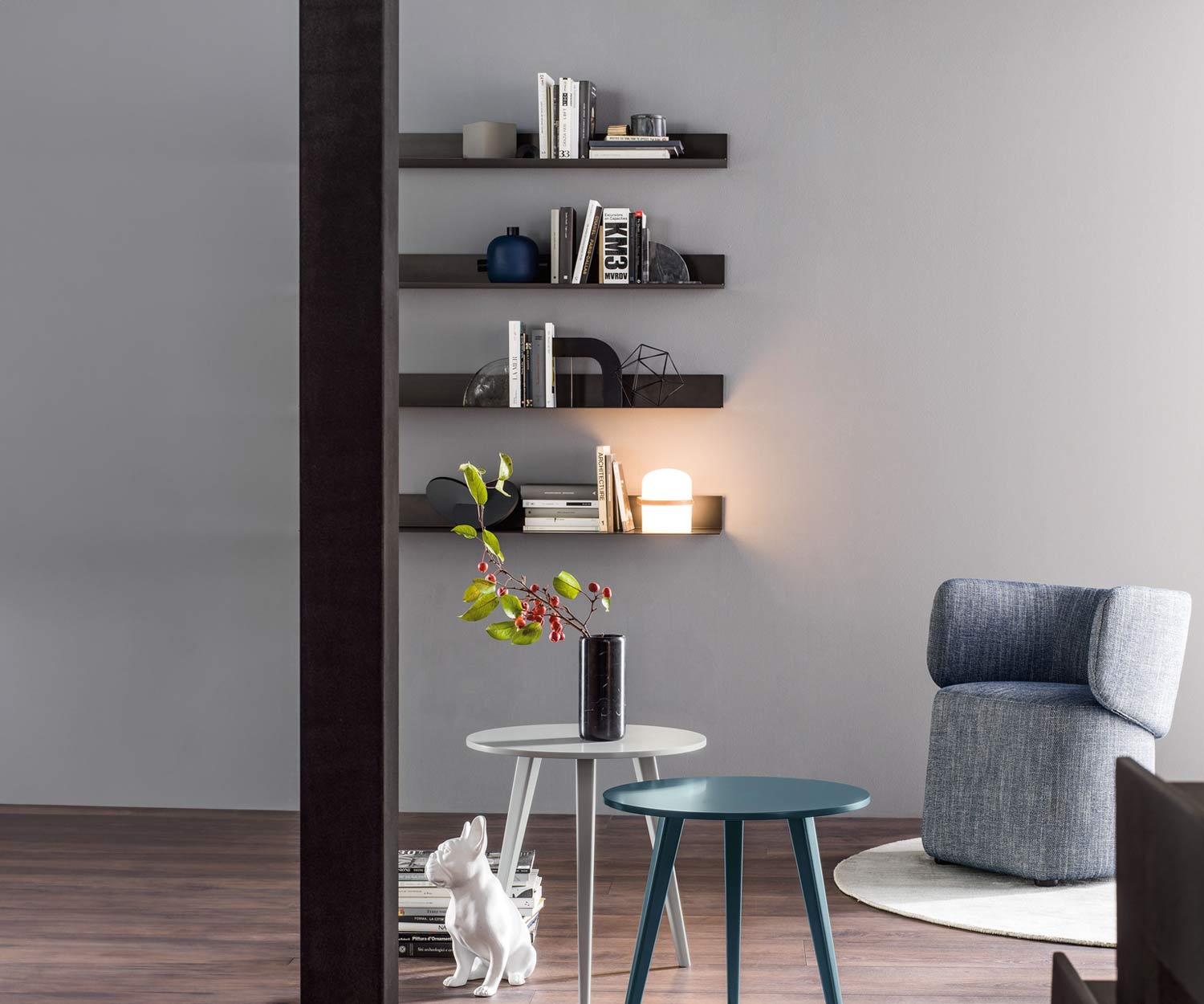 La superficie della mensola a muro Ellie è disponibile in 5 diverse finiture laccate opache È sufficiente selezionare il colore desiderato nel menu di configurazione.