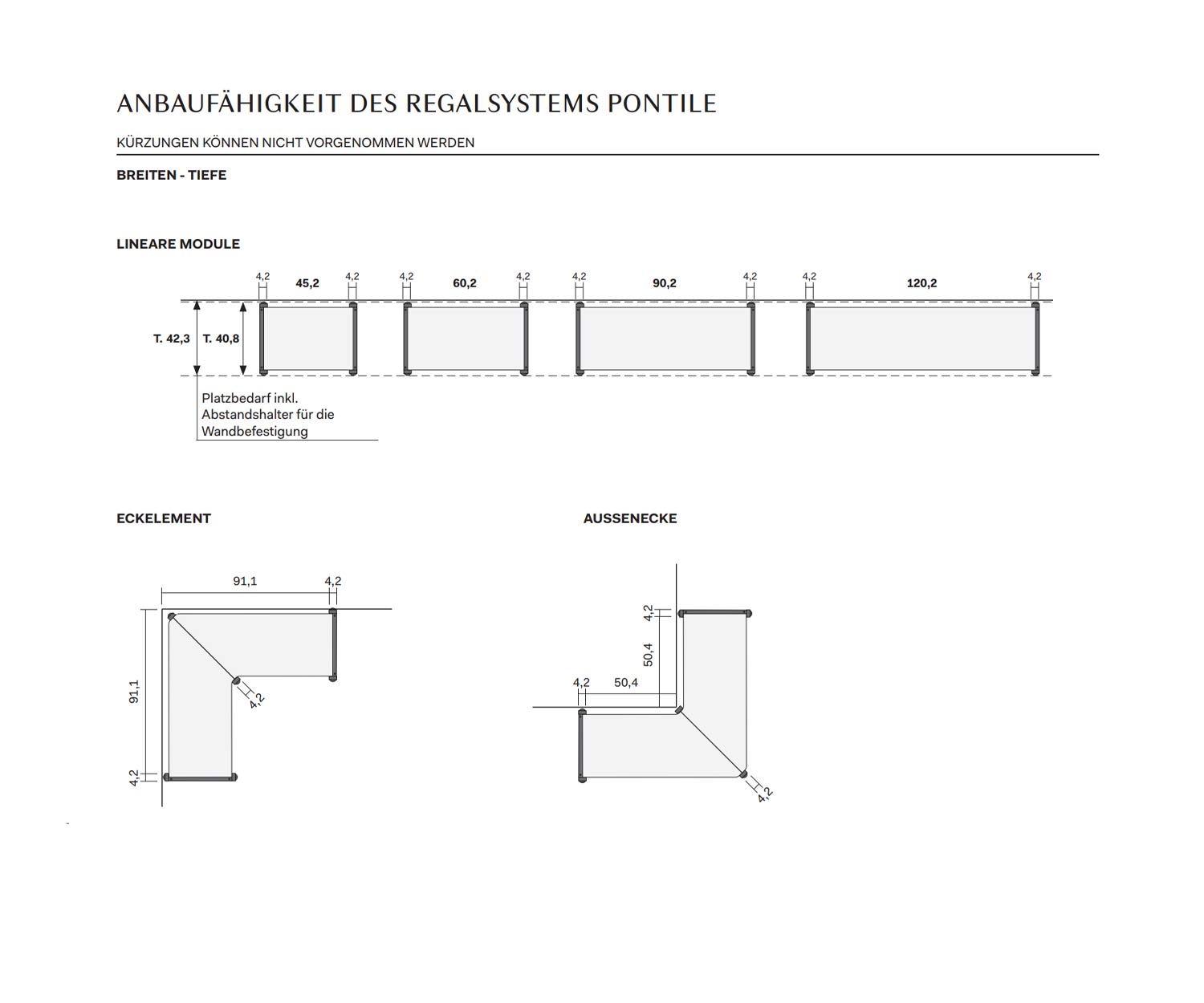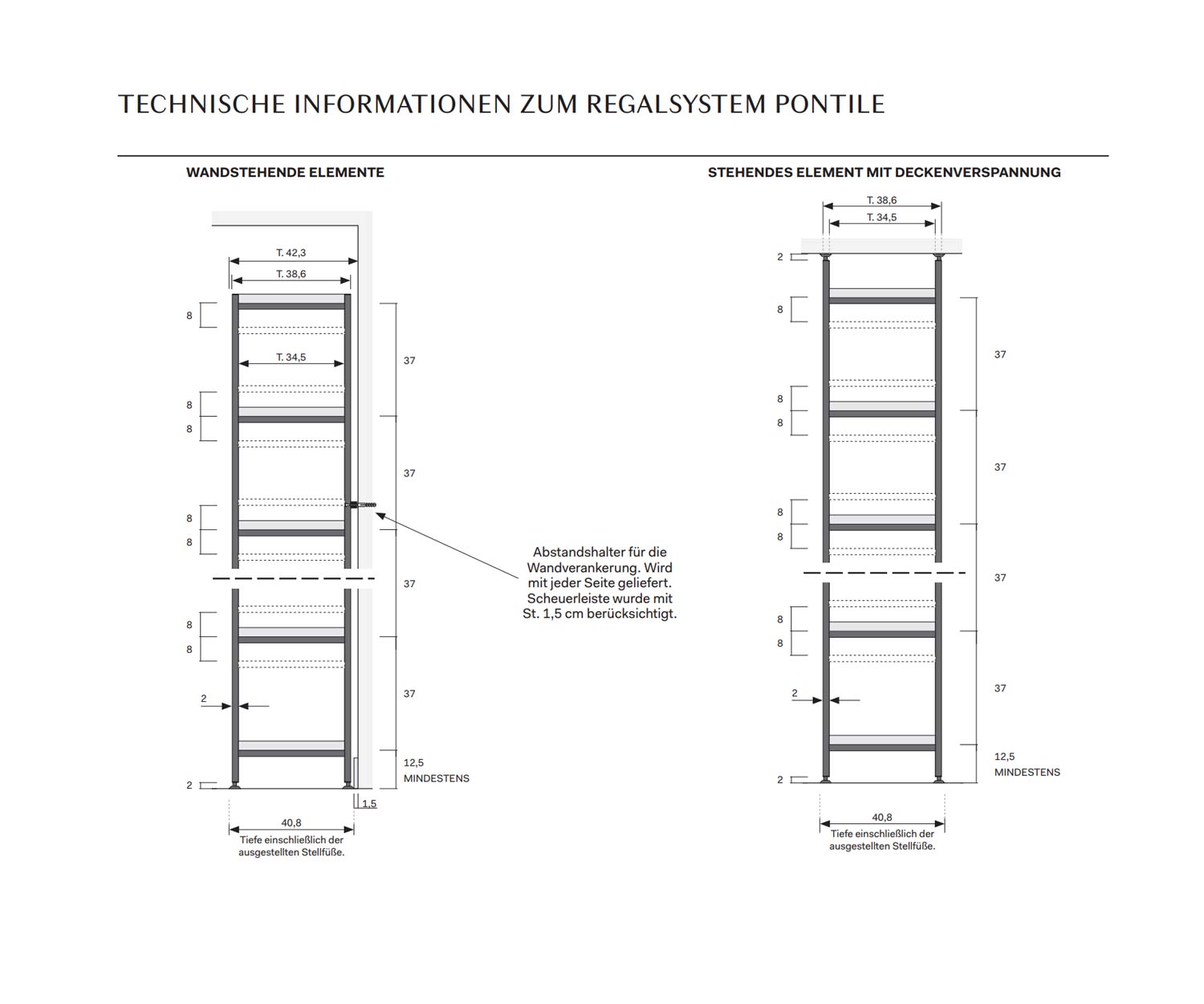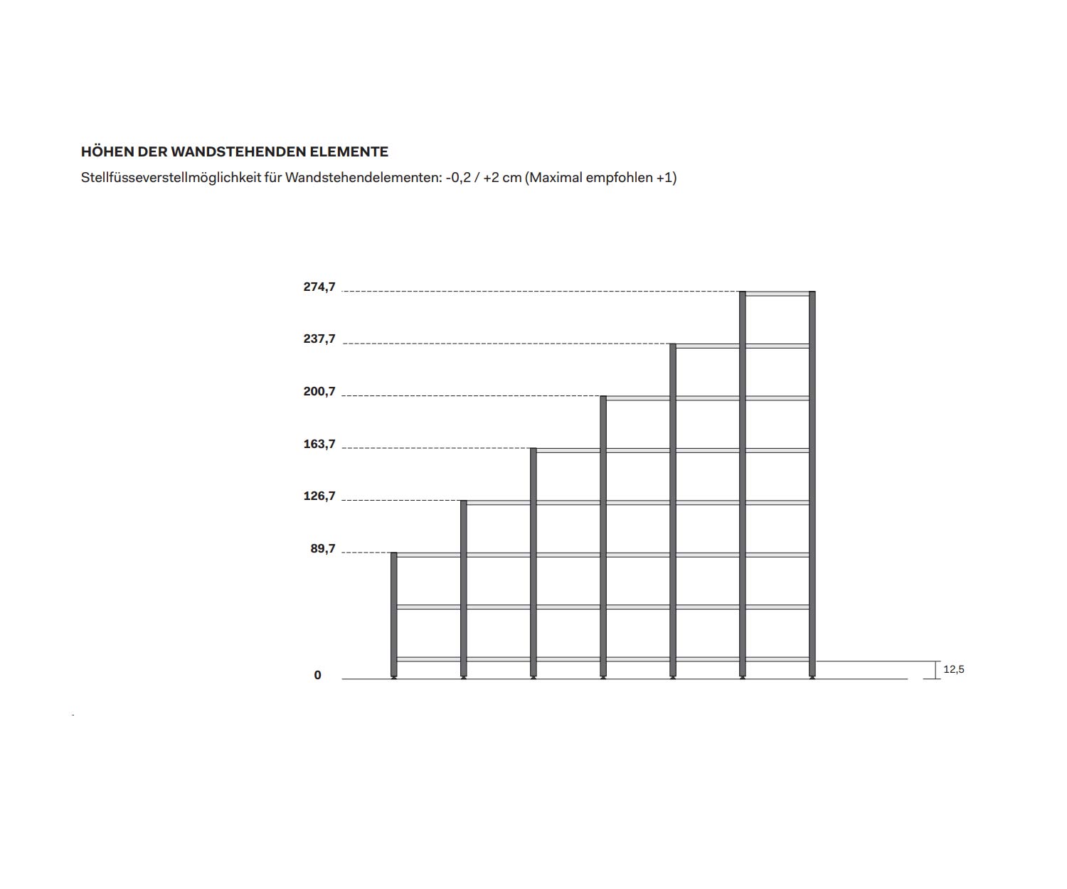 Lo scaffale può essere variato in larghezza e in altezza (vedi schizzo per le dimensioni possibili). Su richiesta è possibile integrare scatole chiuse e aperte.