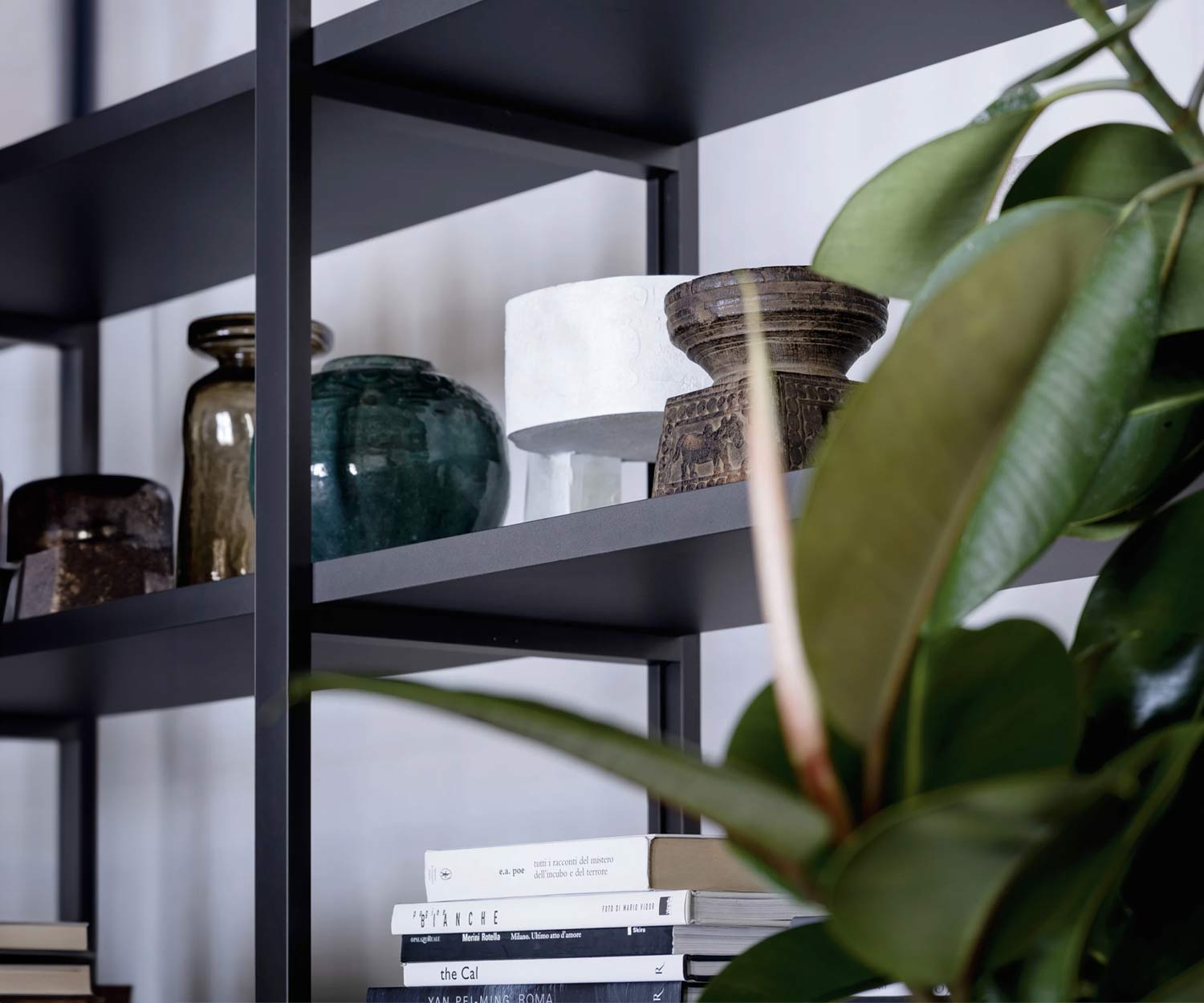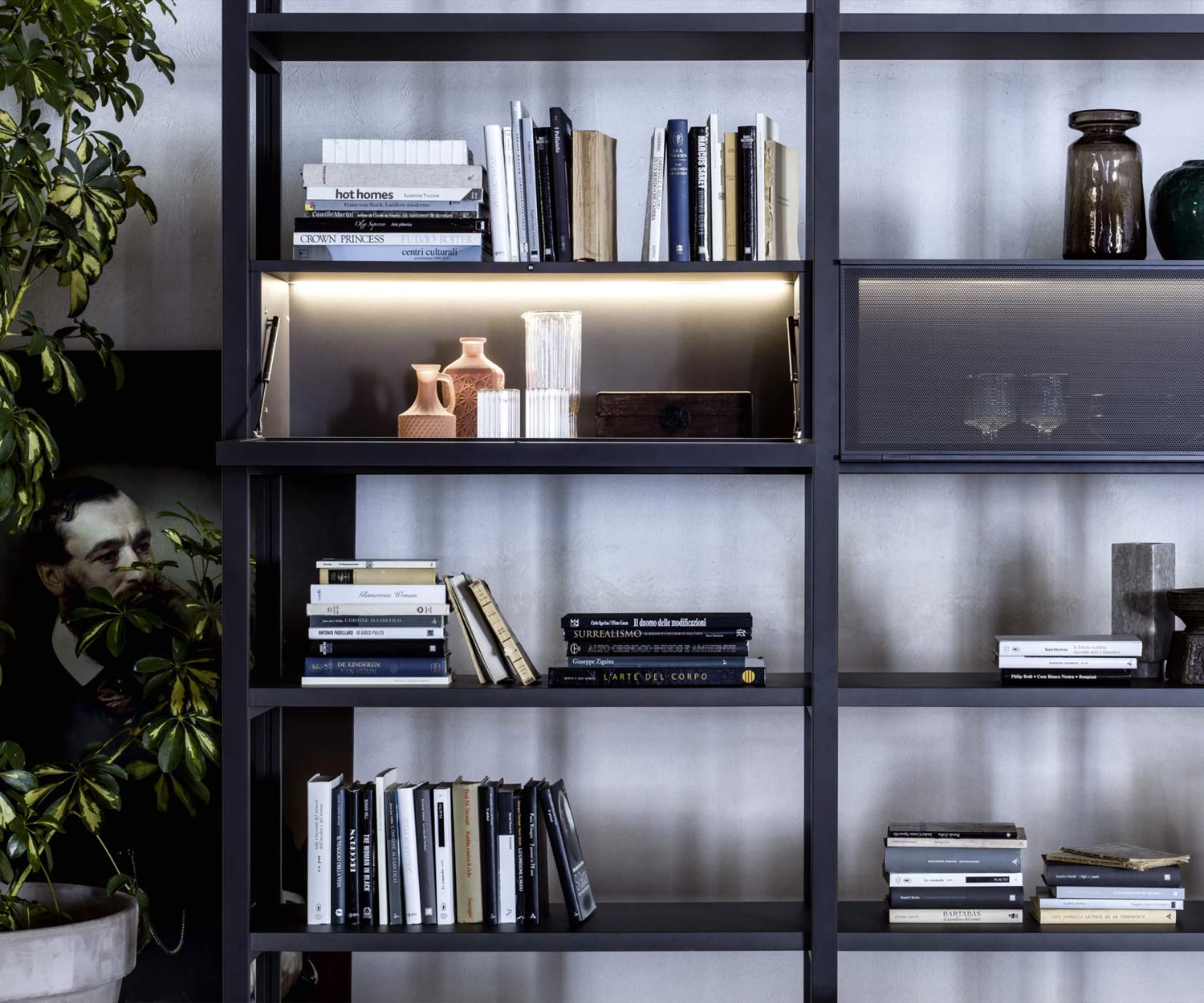 Moderna scaffalatura in metallo Pontile. Il sistema di scaffalature è realizzato solo su ordinazione da Novamobili in Italia. Su richiesta, possiamo configurare le dimensioni dello scaffale desiderate.