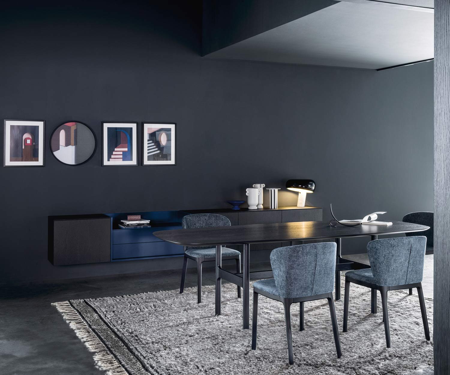 Il legno è marrone chiaro o marrone scuro, a seconda della versione. I rivestimenti in tessuto della sedia Novamobili Design Navy sono disponibili in grigio scuro, beige, blu scuro o grigio chiaro.