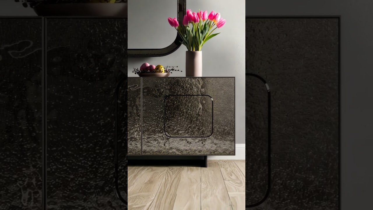 Il frontale della credenza di design in vetro Ozzio Giulia è disponibile nei colori nei colori grigio vetro o bronzo vetro. Il resto del mobile è laccato in Ardesia opaca (se si sceglie il grigio vetro) o bronzo opaco (se si sceglie il bronzo vetro). (se si sceglie il vetro bronzo).