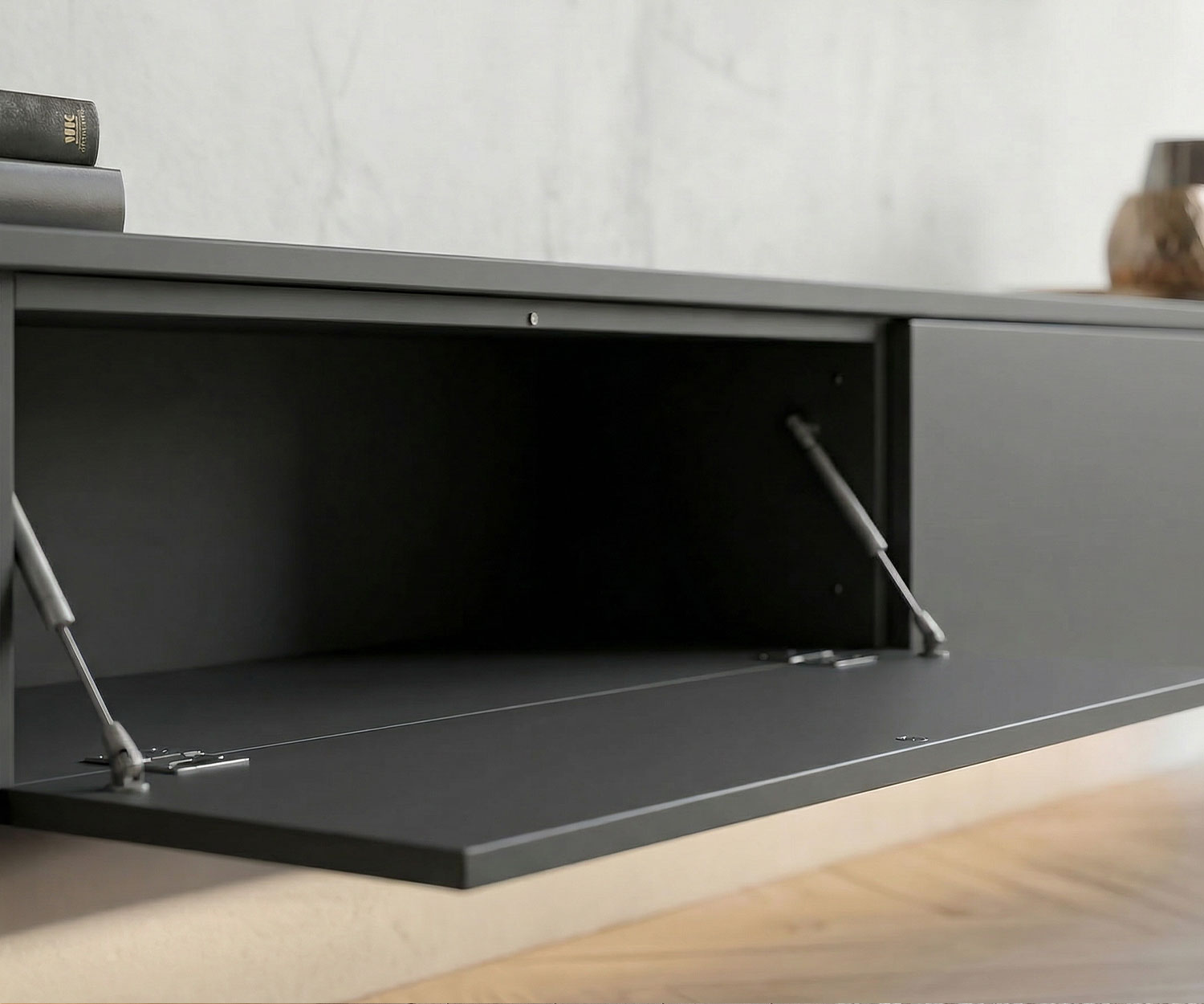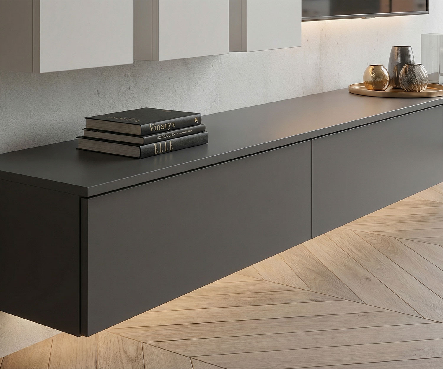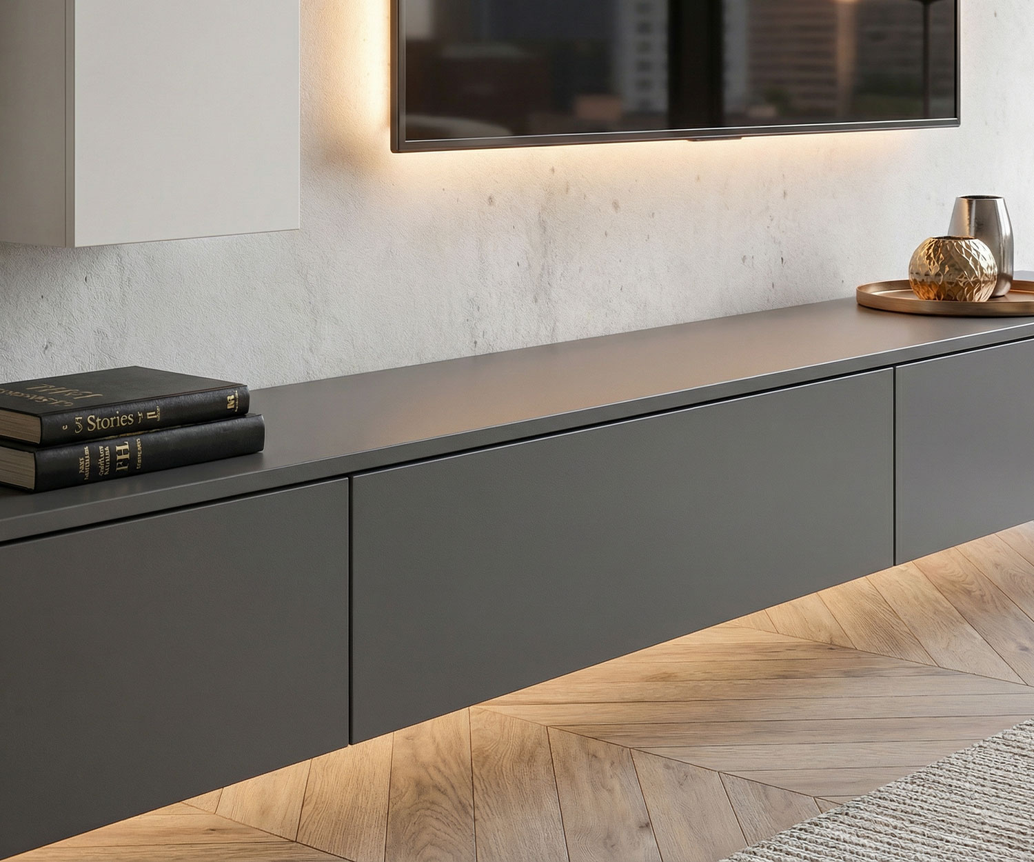La credenza è disponibile in grigio antracite opaco (RAL7043). I tre pensili sono laccati in bianco opaco (RAL9016) e convincono per la loro superficie vellutata.