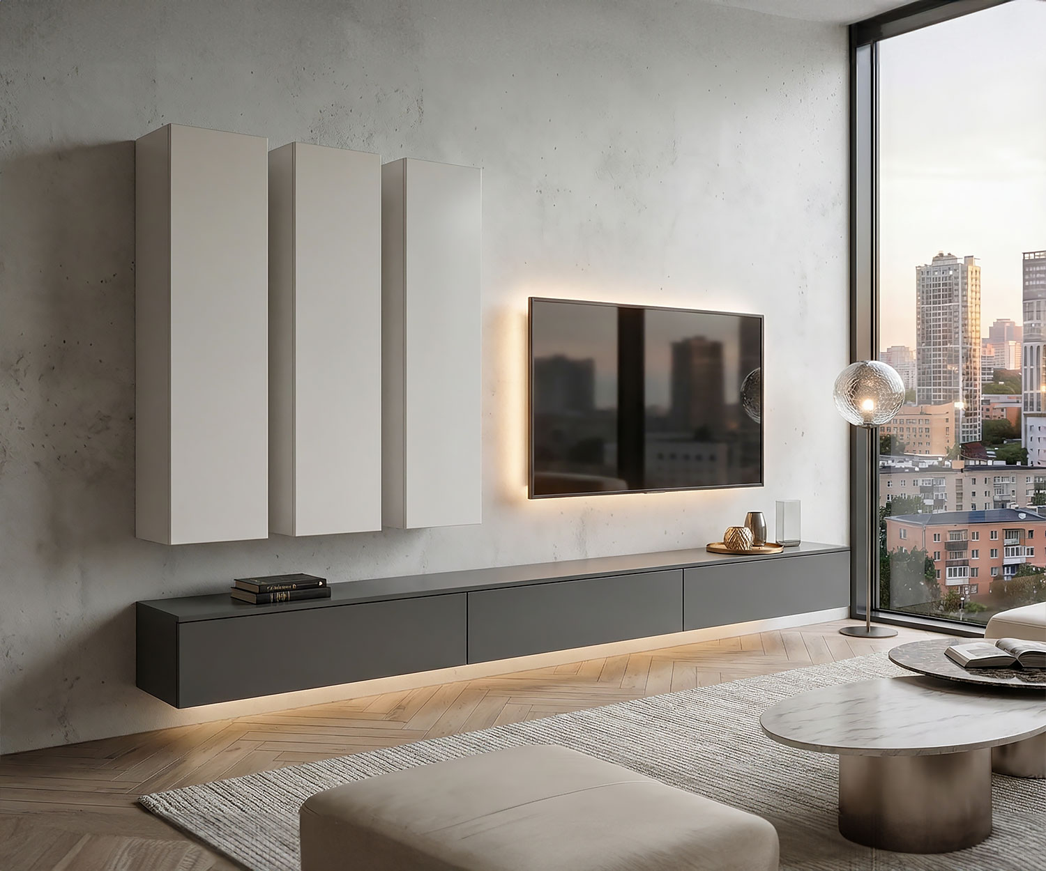 L'intelligente combinazione di un mobile basso extra-largo e di eleganti pensili galleggianti combina il massimo dell'estetica con un pratico spazio di archiviazione per il vostro soggiorno. Ogni elemento è un vero e proprio pezzo forte ed è prodotto esclusivamente per voi in Italia come mobile di design di alta qualità.