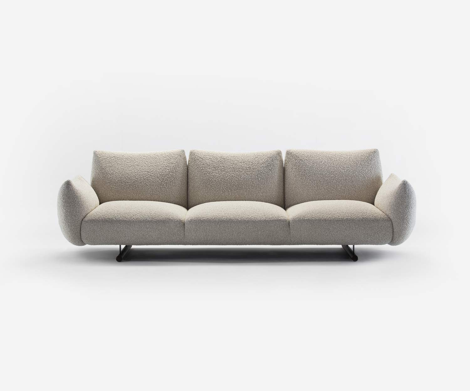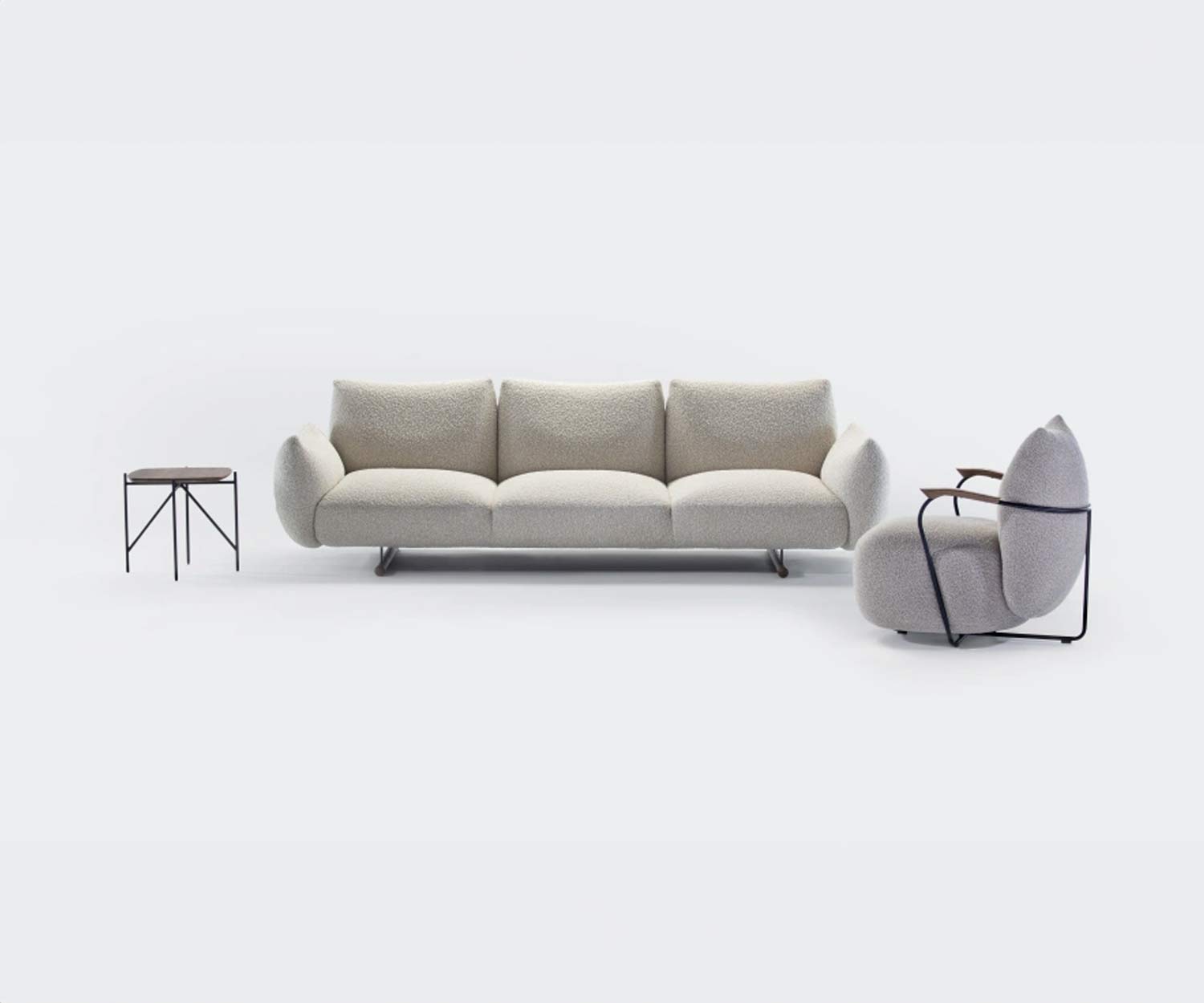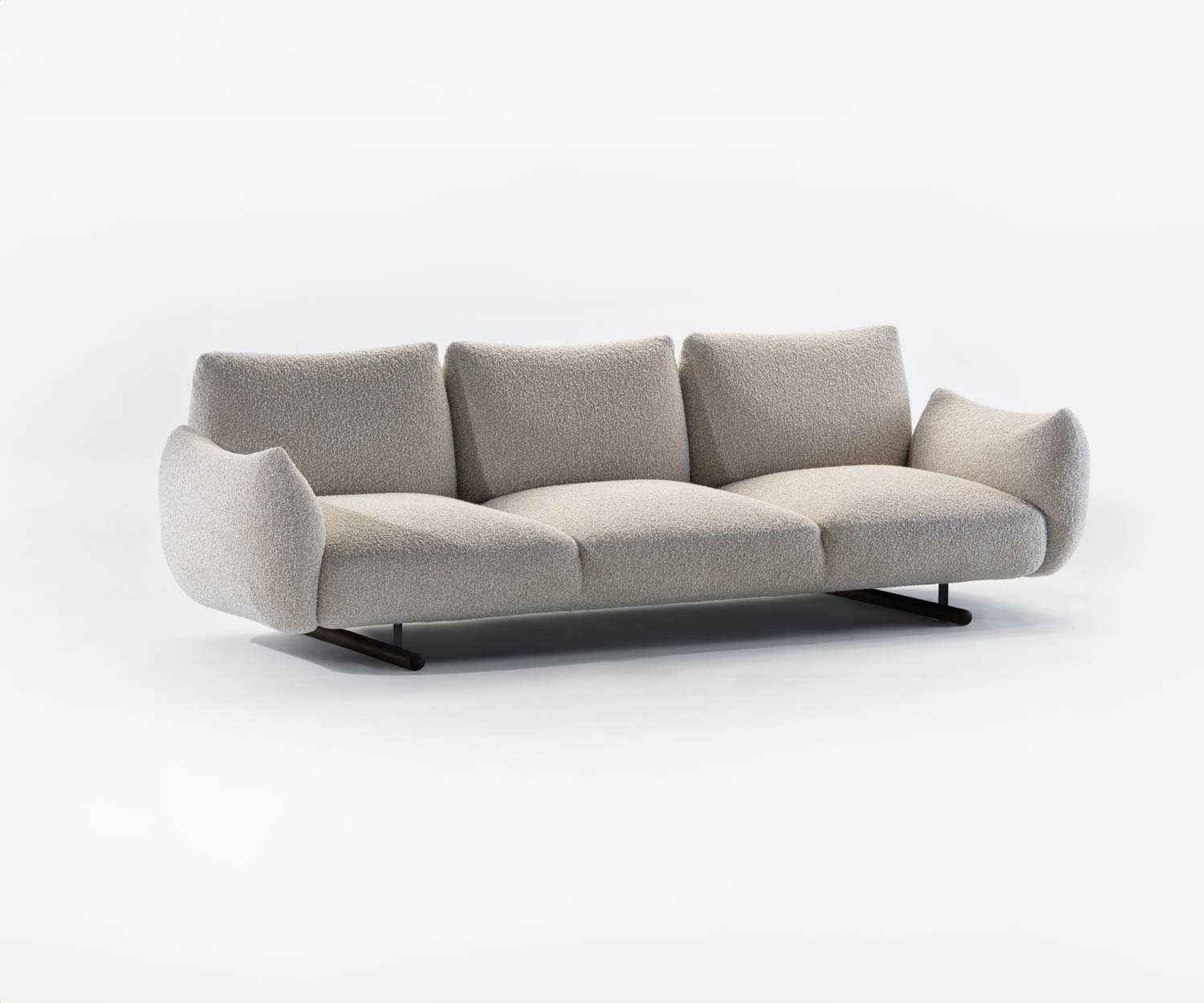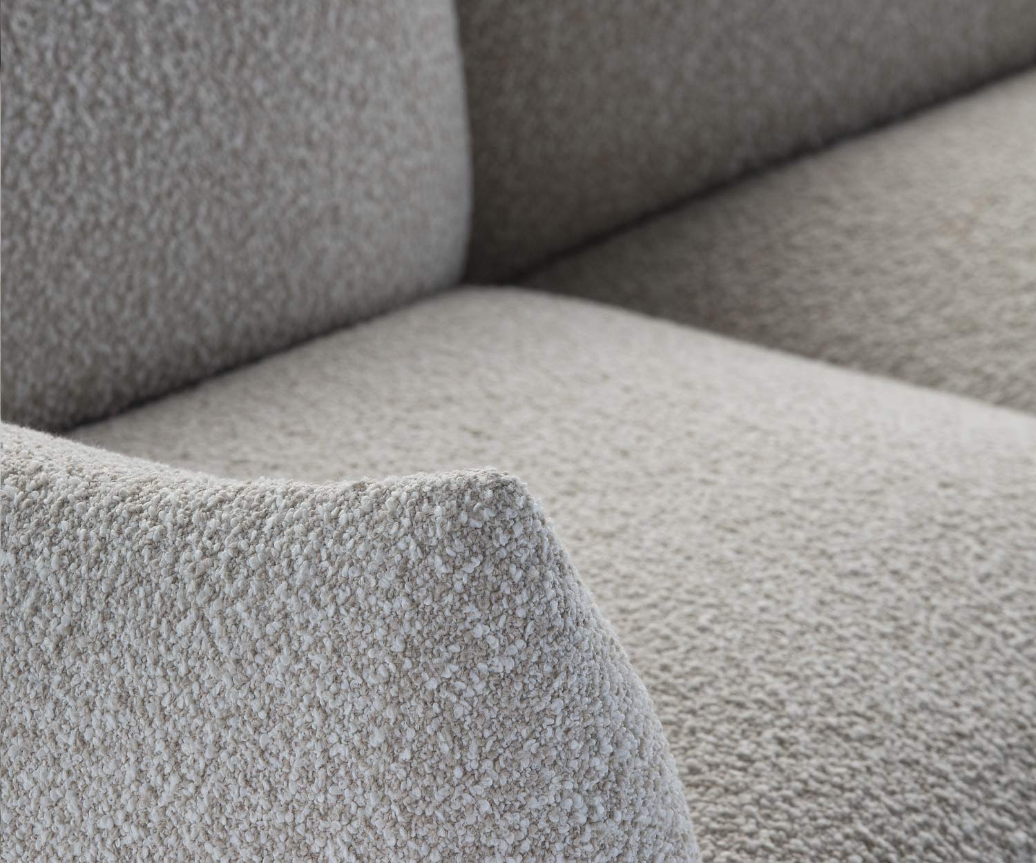 I l tessuto di rivestimento del divano di design Buffa è disponibile in 3 colori: beige bouclé, grigio chiaroo grigio scuro. Il divano Buffa è disponibile in due versioni: a 2 e a 3 posti, ciascuna con l'opzione di un bracciolo per un maggiore comfort.
