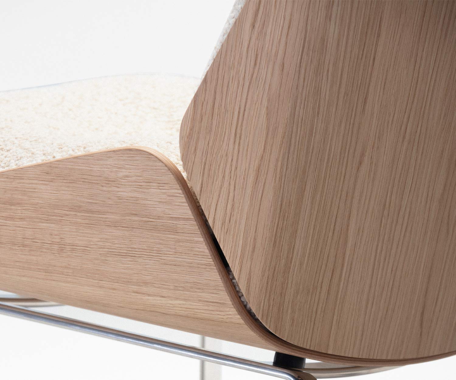a scocca flessibile e sagomata, realizzata in compensato sagomato di alta qualità, è rifinita in pregiato rovere o impiallacciato noce e si combina armoniosamente con la morbida imbottitura rivestita in pelle o tessuto.